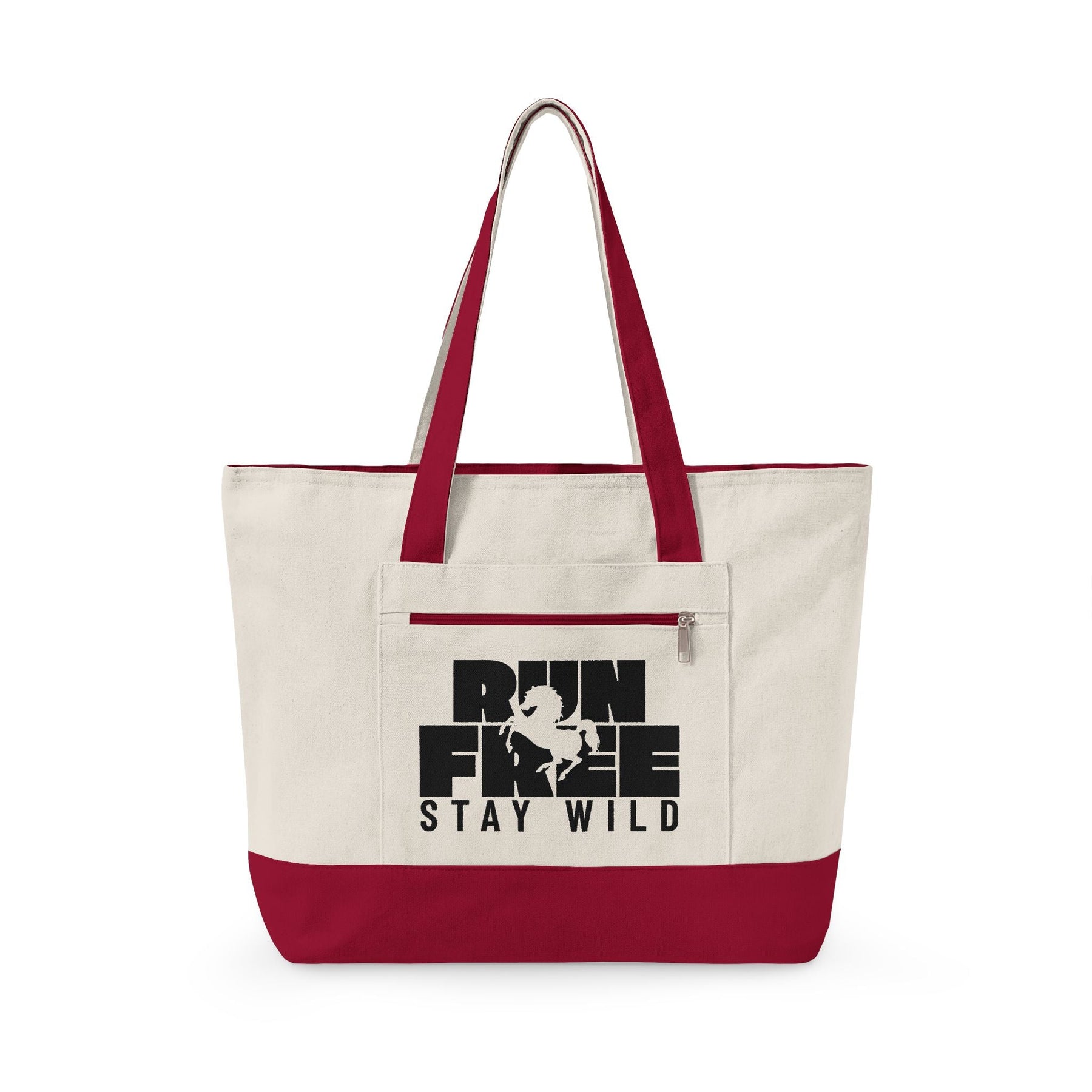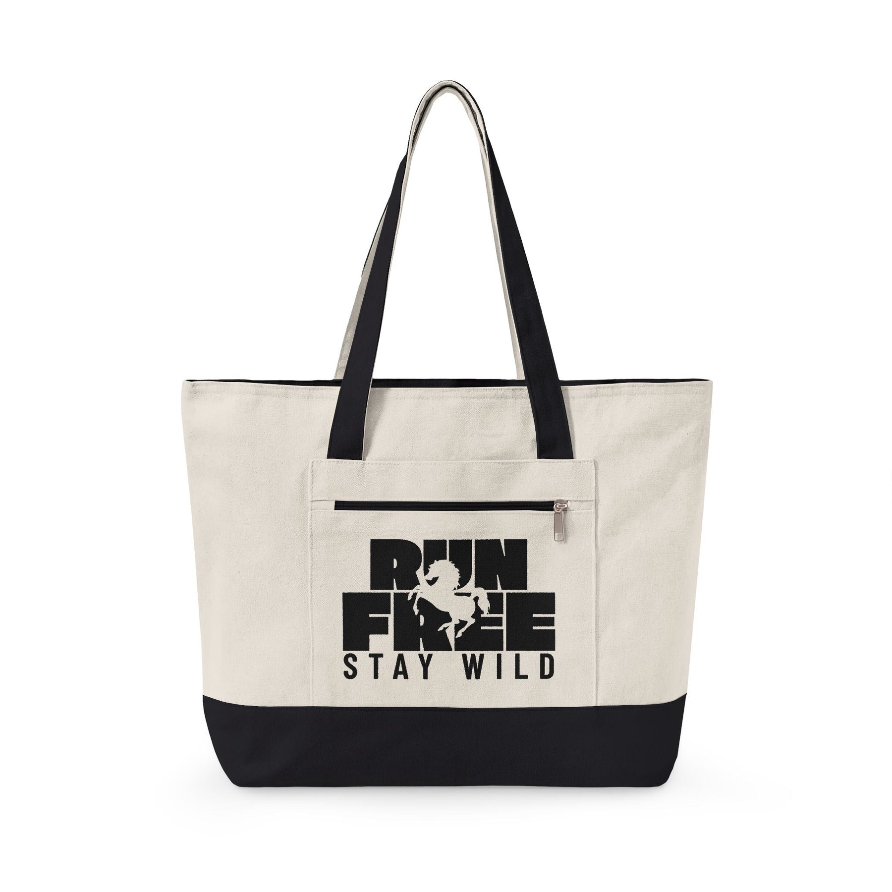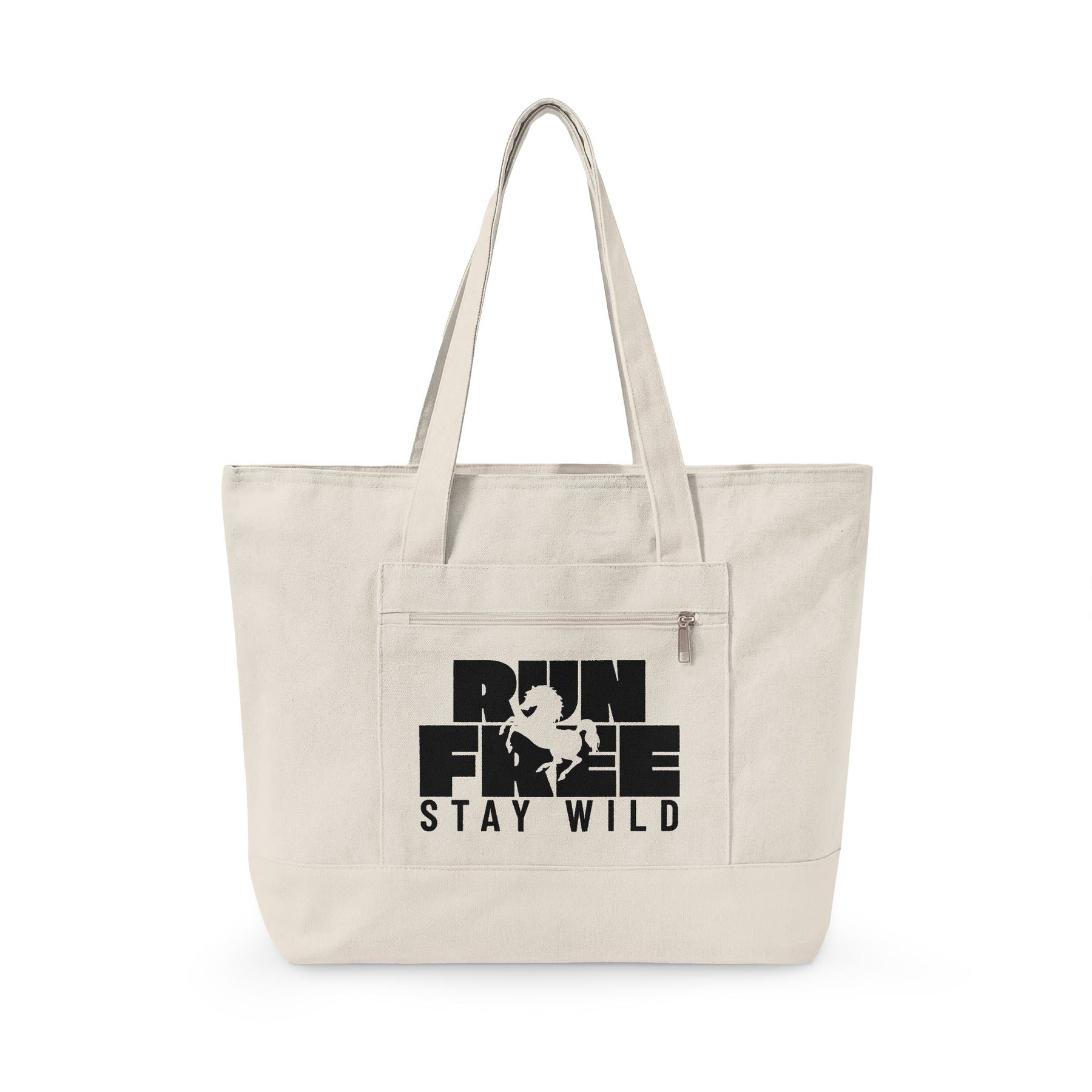 Run Free Stay Wild large canvas tote bag with full zipper, front pocket, and black reinforced base for everyday use