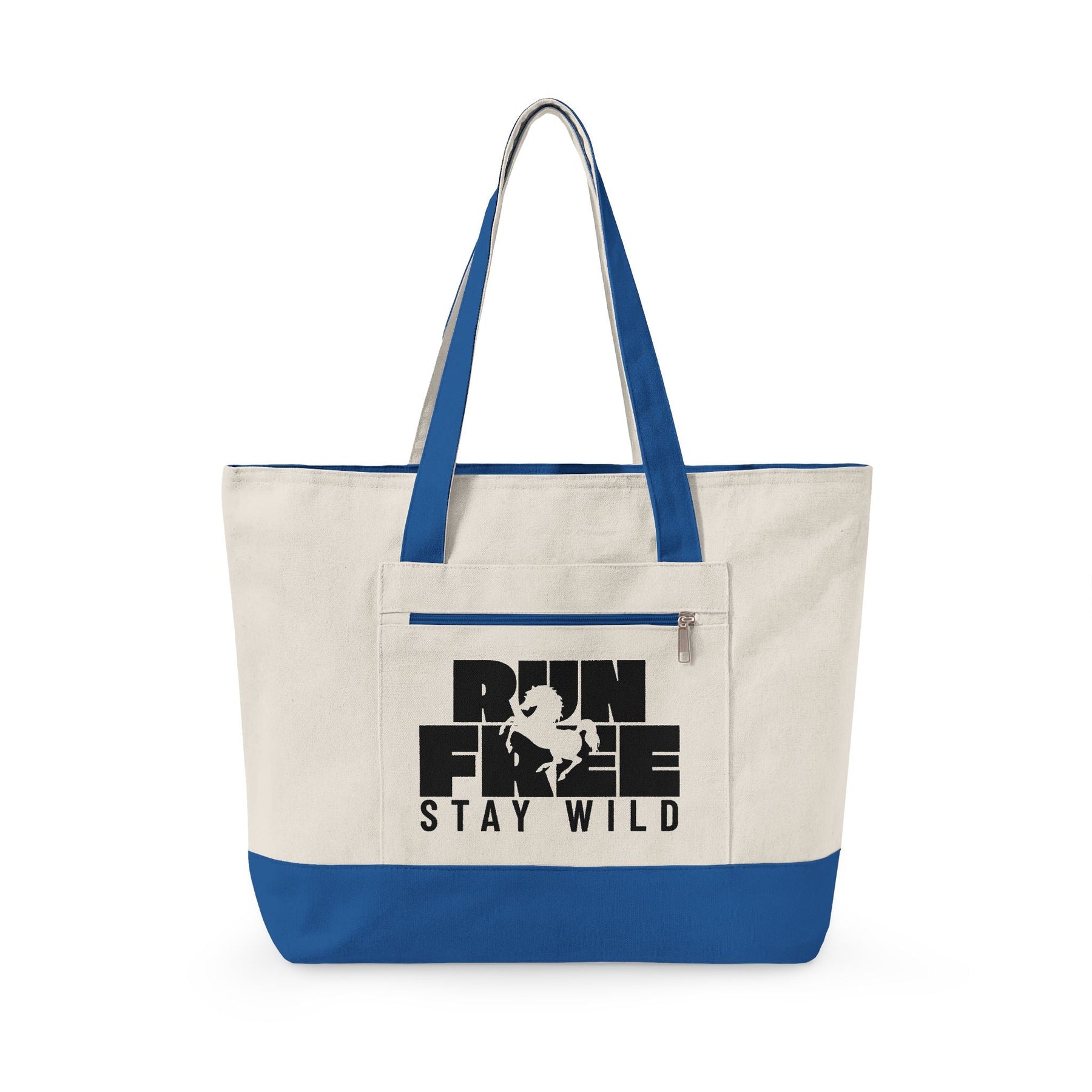 Run Free Stay Wild large zippered canvas tote bag for grocery, beach, and everyday use
