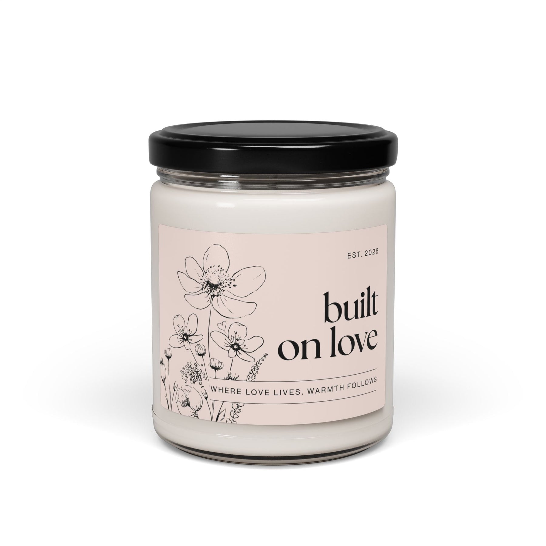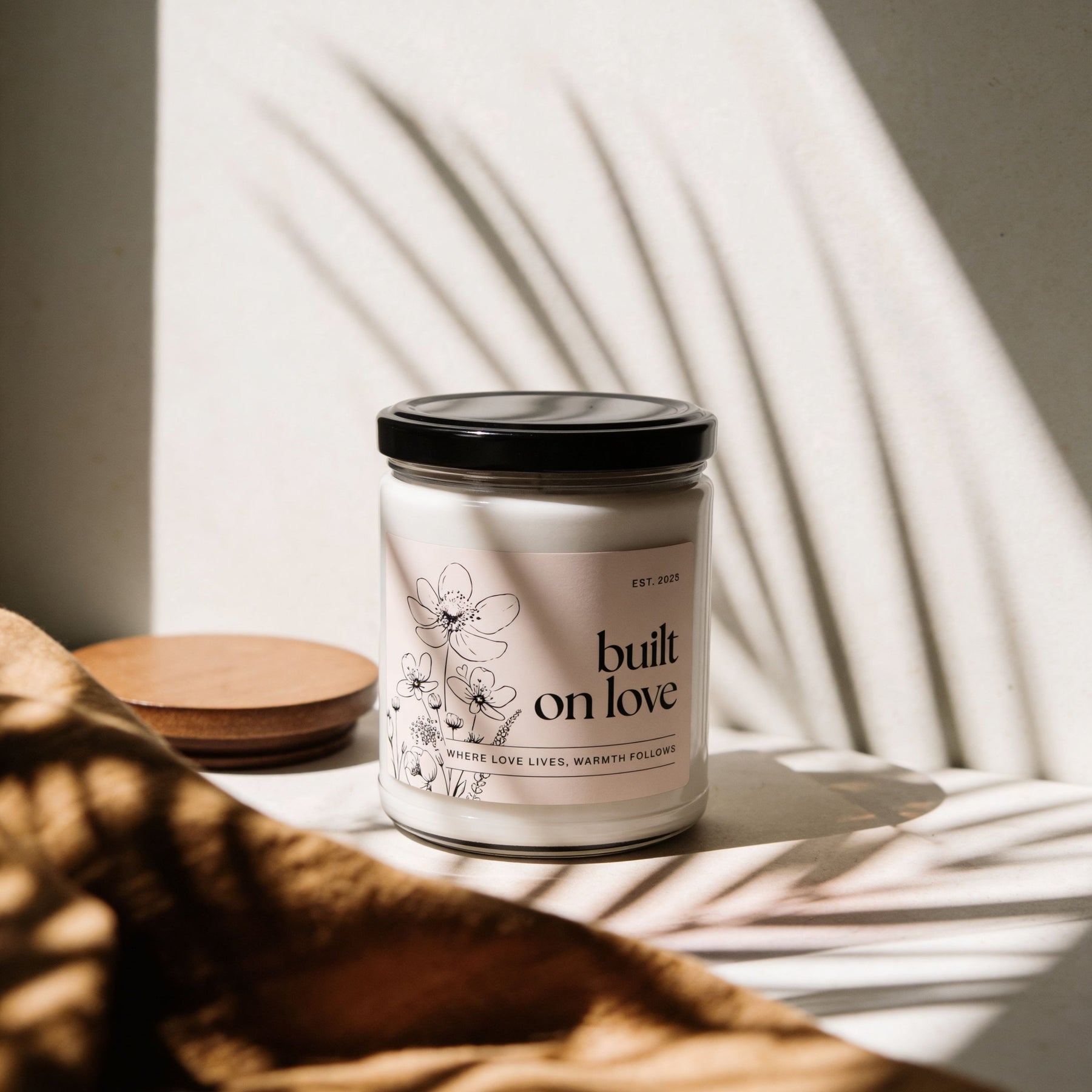Built on Love warm 9oz soy candle in reusable glass jar with botanical label