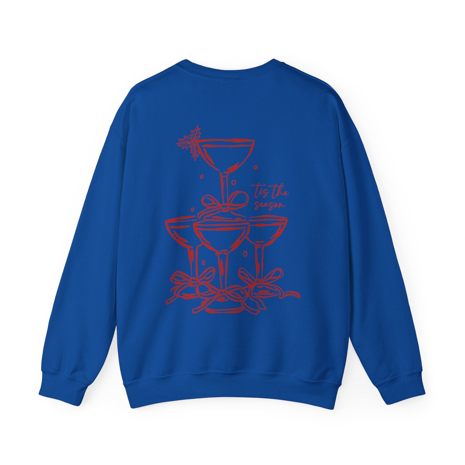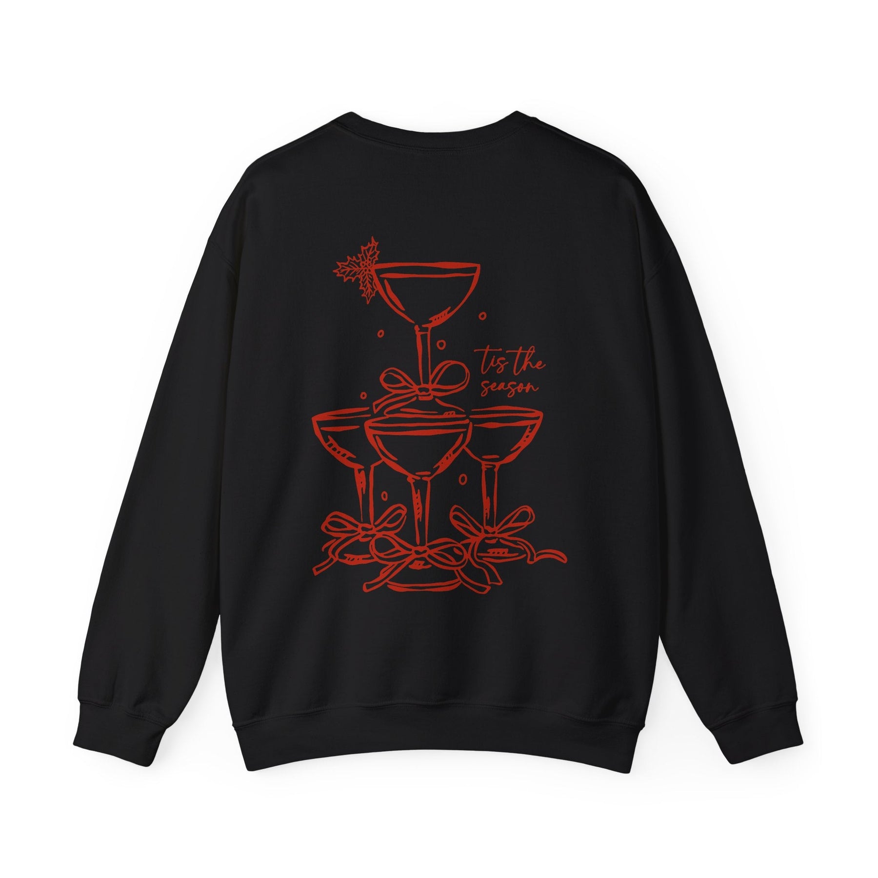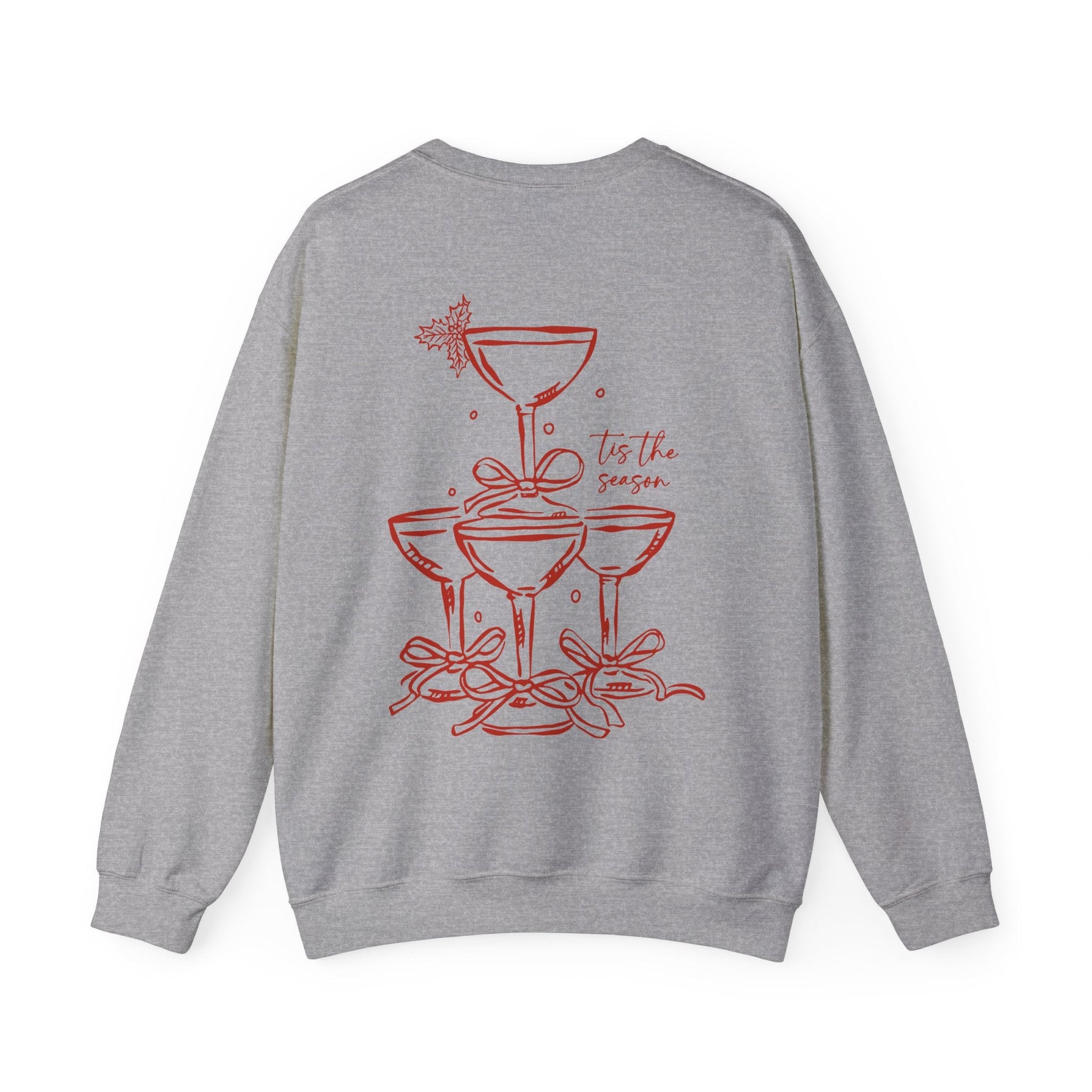 This sweatshirt features a coquette bow on the front and a champagne tower with bows on the back, giving off a festive and playful vibe. Perfect for anyone looking to add a touch of holiday spirit to their wardrobe, this sweatshirt is ideal for adults celebrating the season.