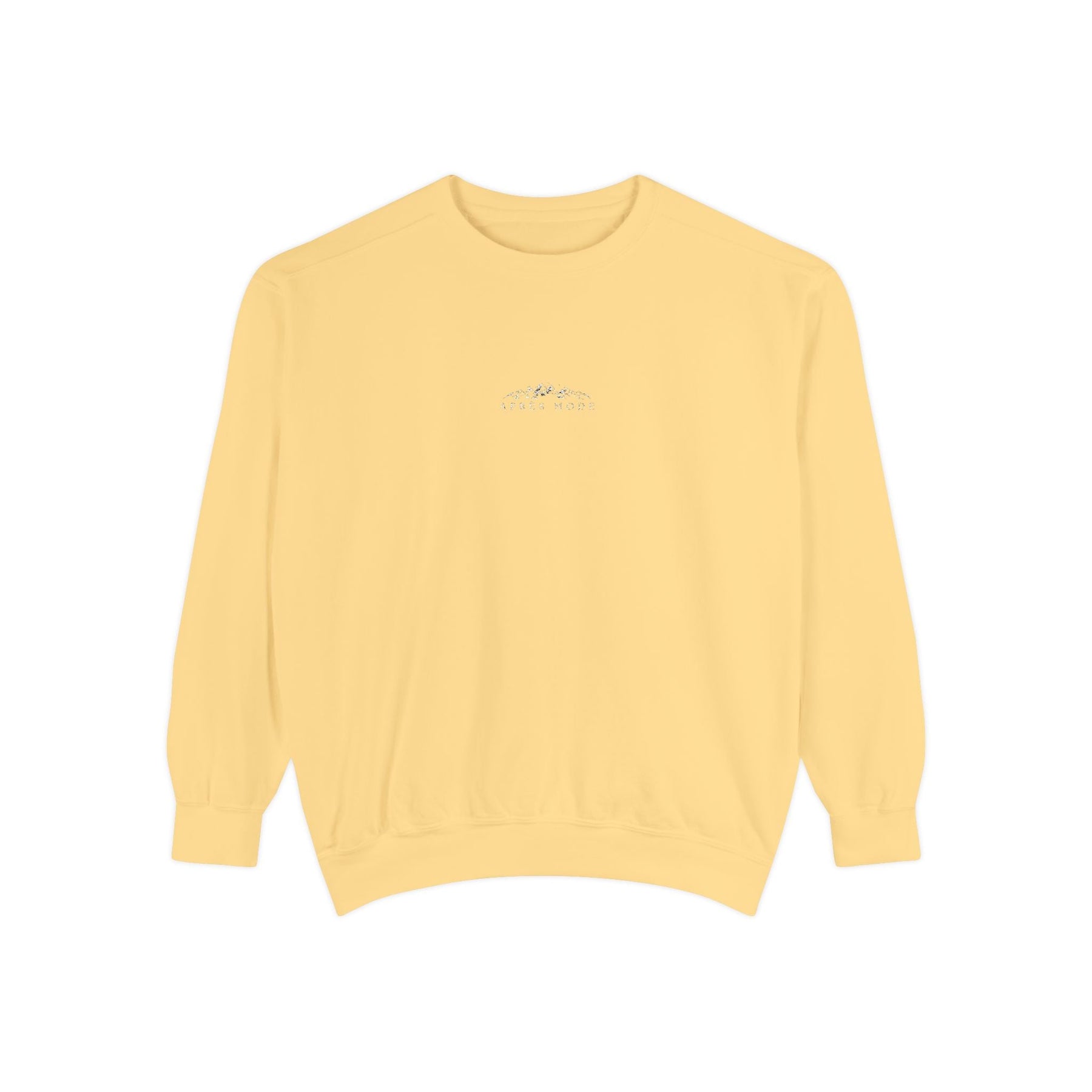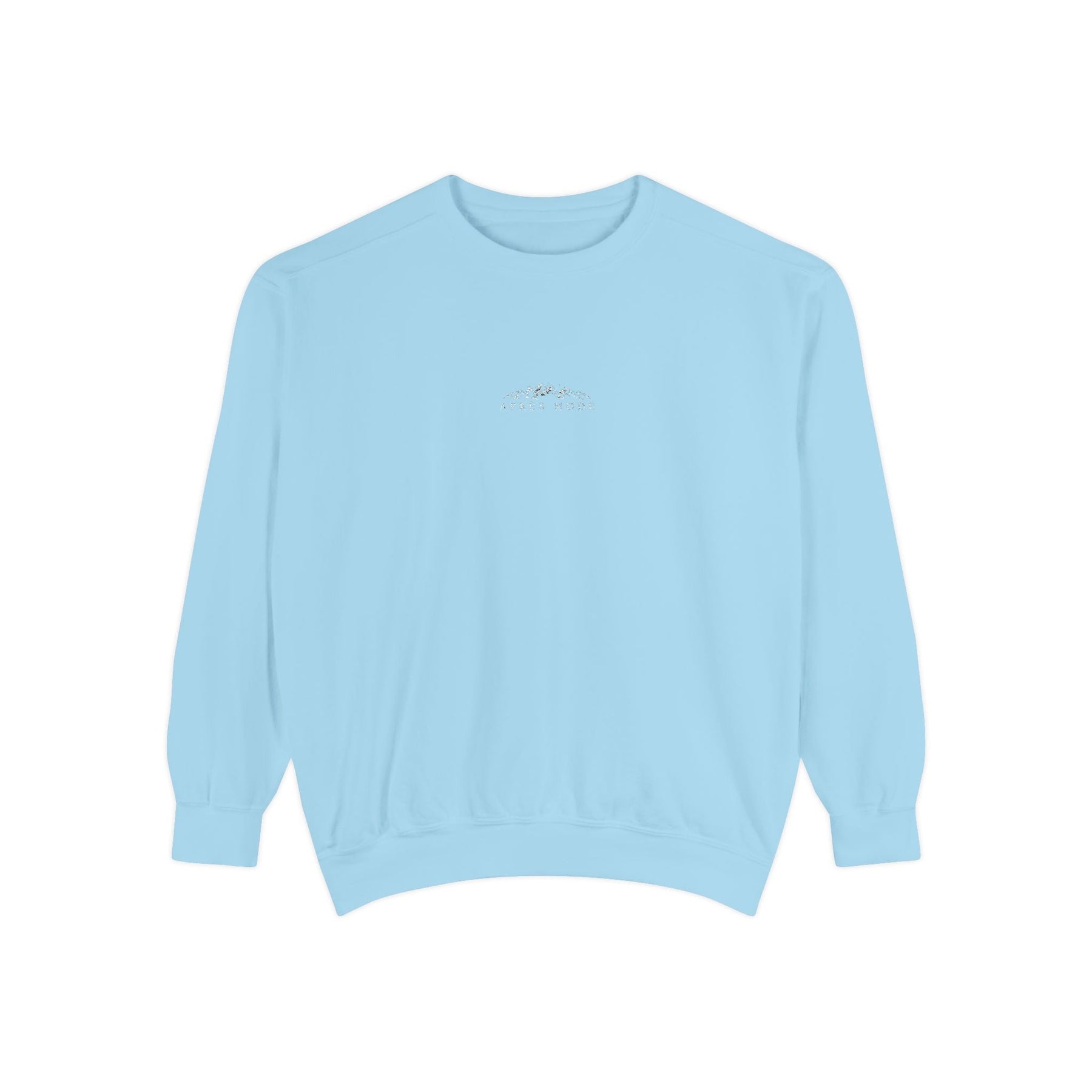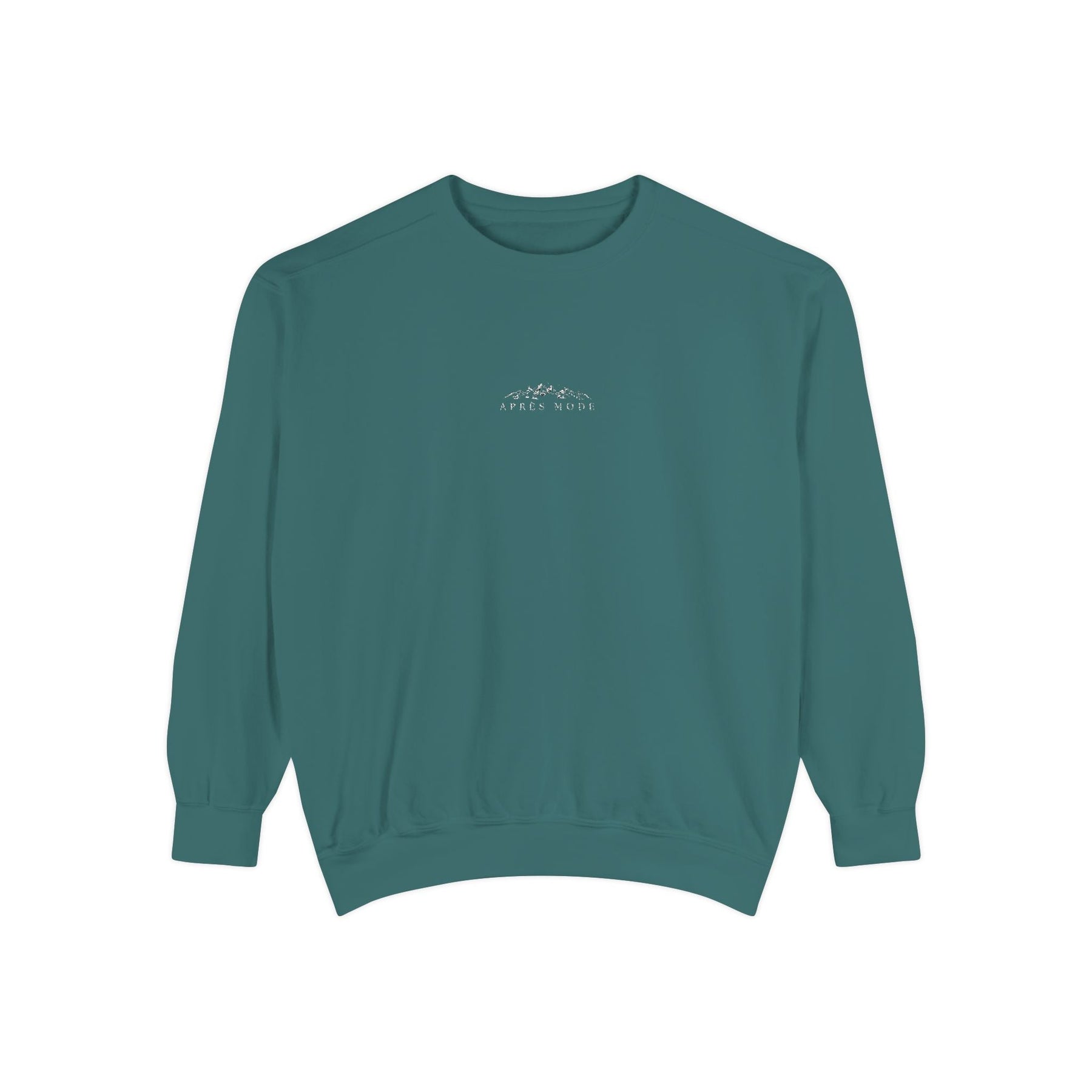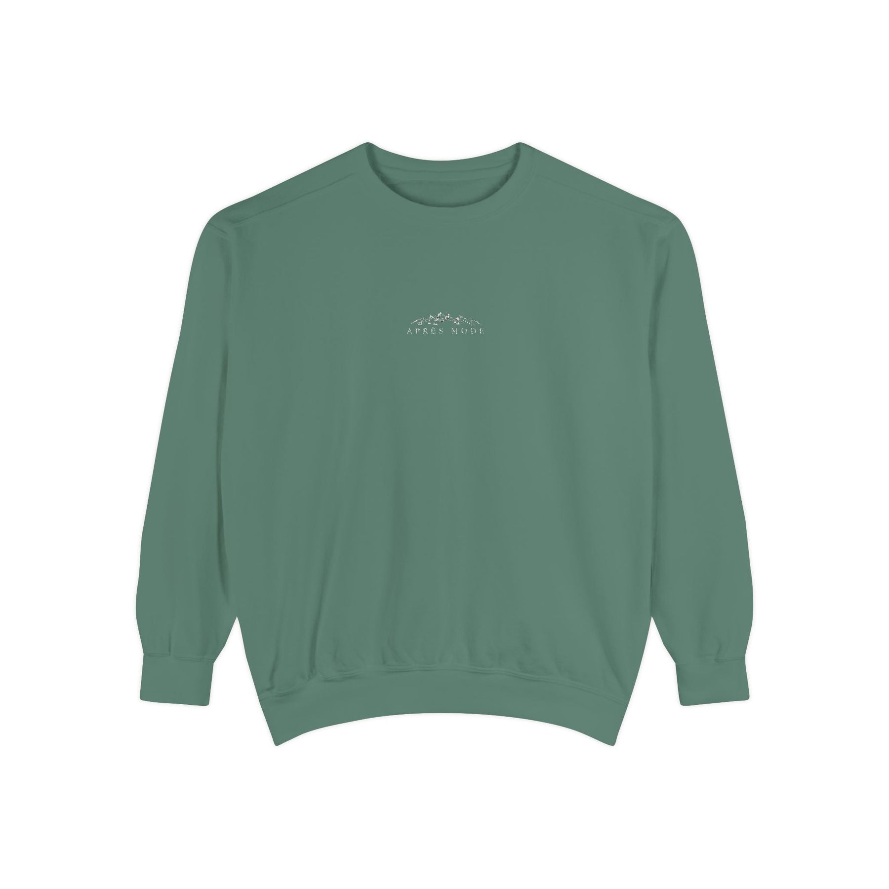 This Unisex Garment-Dyed Sweatshirt features an embroidery of a mountain skiing scene and the phrase 'apres Mode'. The sweatshirt has a relaxed fit and is made of 80% cotton and 20% polyester, giving it a soft and luxurious feel. Perfect for adults looking for a comfortable and stylish sweatshirt to wear during winter holidays or ski trips.