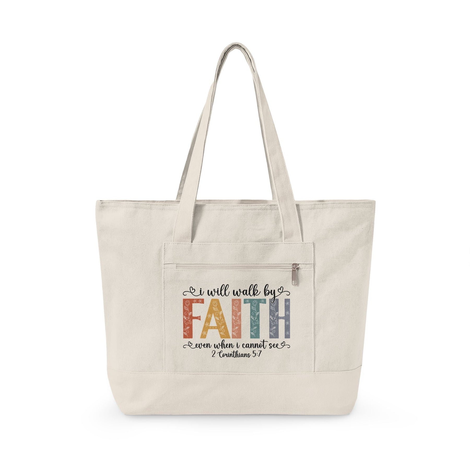 Easter canvas tote bag with Christian Bible verse, zippered closure, durable 12 oz cotton canvas, and front pocket.