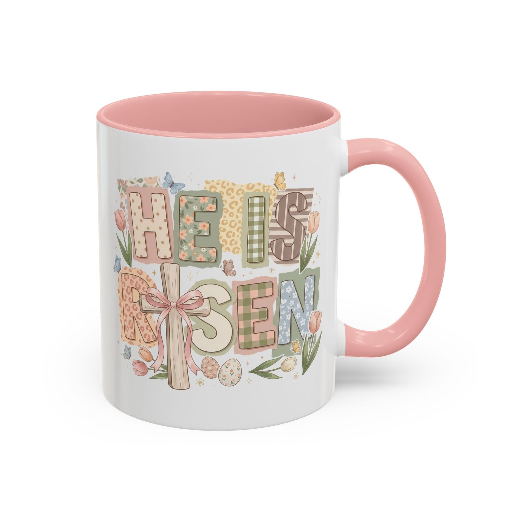Mug shaped like a quiet morning at the hilltop. Soft sunrise colors, a lone cross rising above a field of wildflowers, and the words “He is not here. He has risen. Matthew 28:6” invite a moment of reflection with every sip. The colored interior and handle add a gentle, crafted touch while the glossy finish lets the artwork glow. This mug settles into reflective routines — church coffee hour, slow mornings, or an after-service chat — and carries a reassuring message that feels like a warm welcome back to faith and calm.