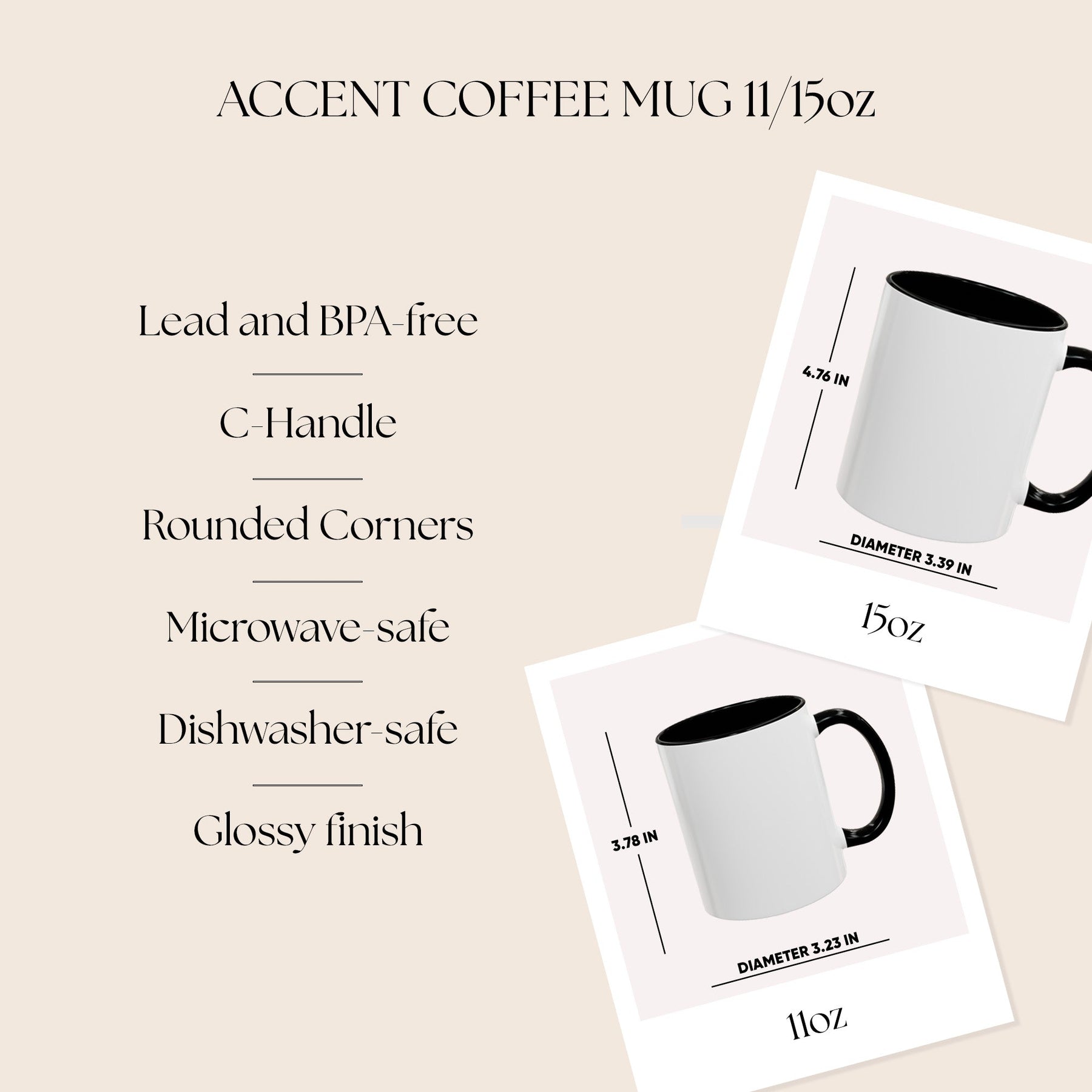 - Available in 11oz and 15oz sizes with colored interior and C-handle