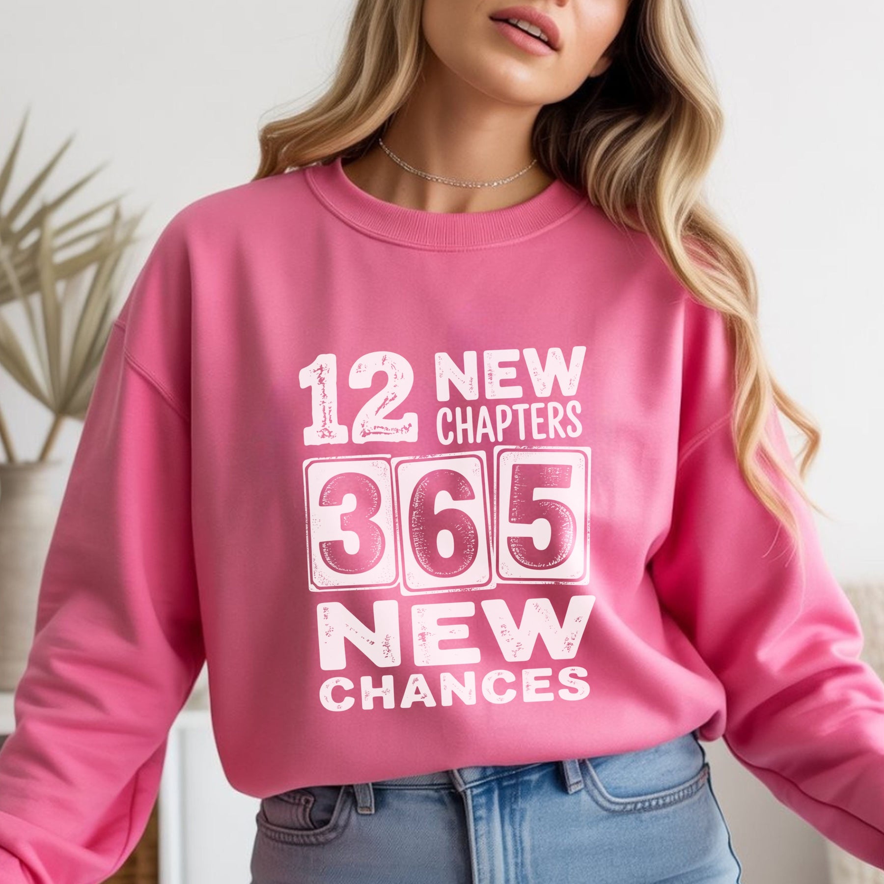 Pink Cheers 2026 Crewneck sweatshirt with 12 new chapters 365 new chances print paired with jeans and gray shoes