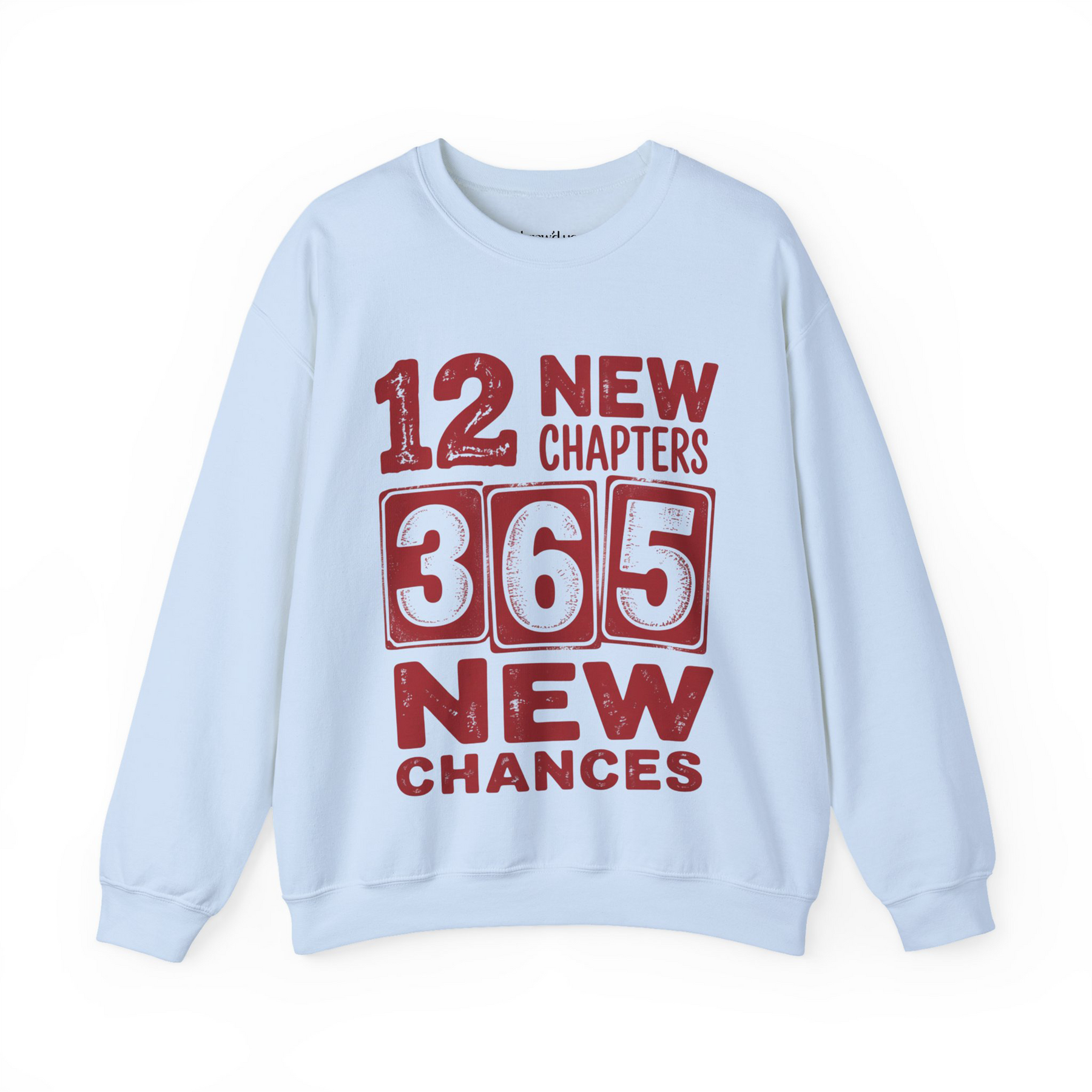 Cheers 2026 Crewneck sweatshirt with 12 New Chapters 365 New Chances red graphic on light blue Gildan 18000 fleece unisex crewneck