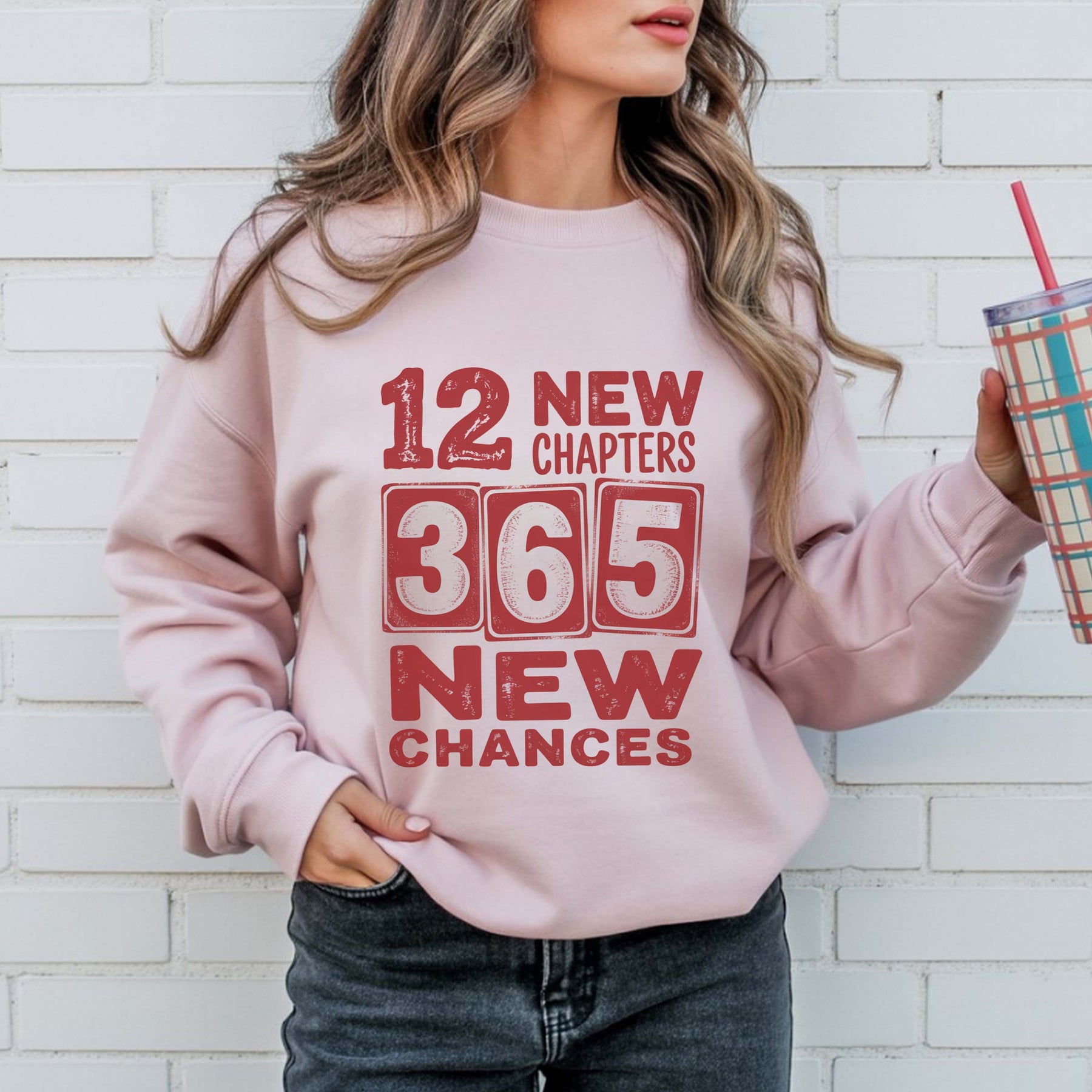 Cheers 2026 Crewneck sweatshirt in pink with 12 new chapters 365 new chances text design