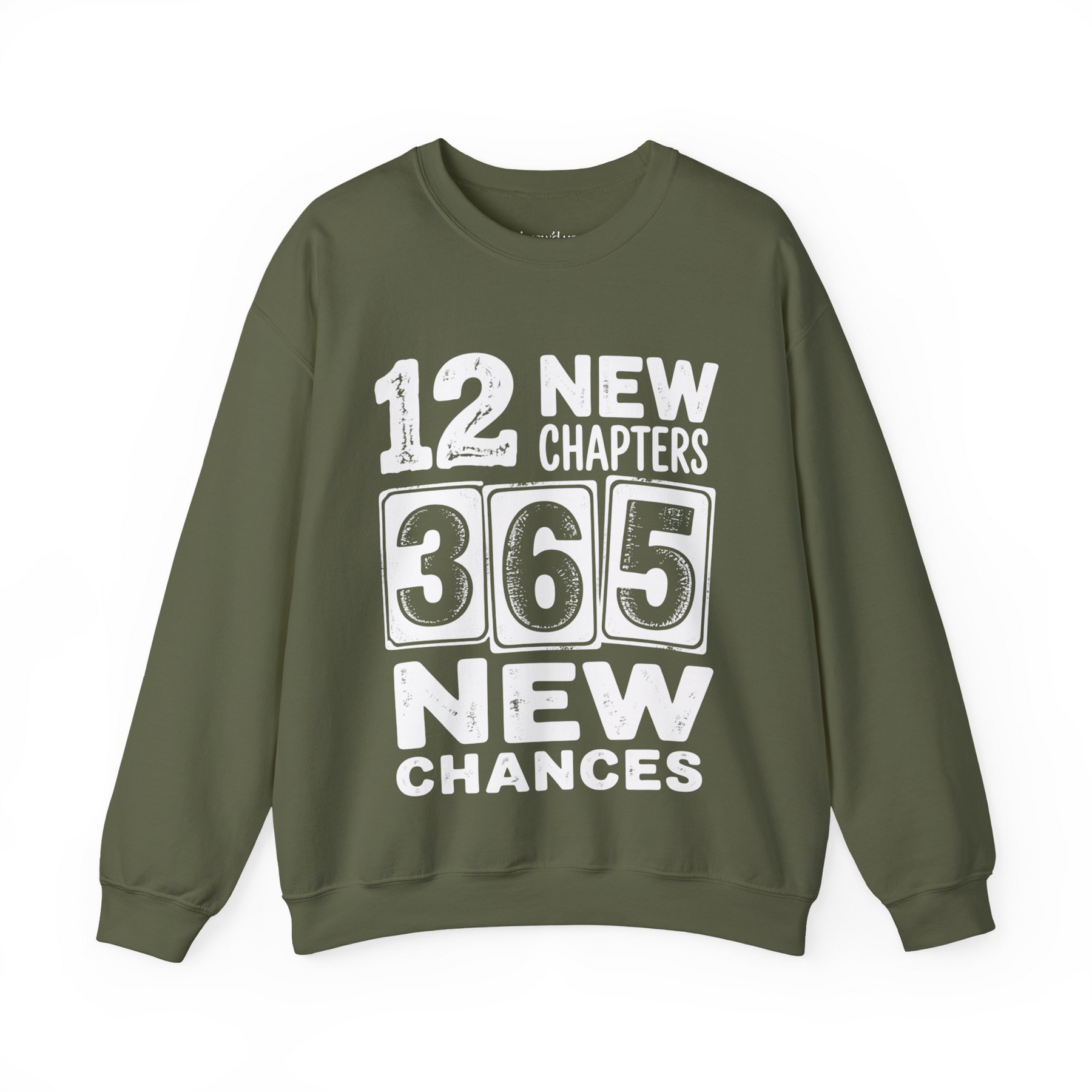 Olive green Cheers 2026 Crewneck sweatshirt with "12 New Chapters 365 New Chances" varsity-style print, Gildan 18000 unisex fleece.