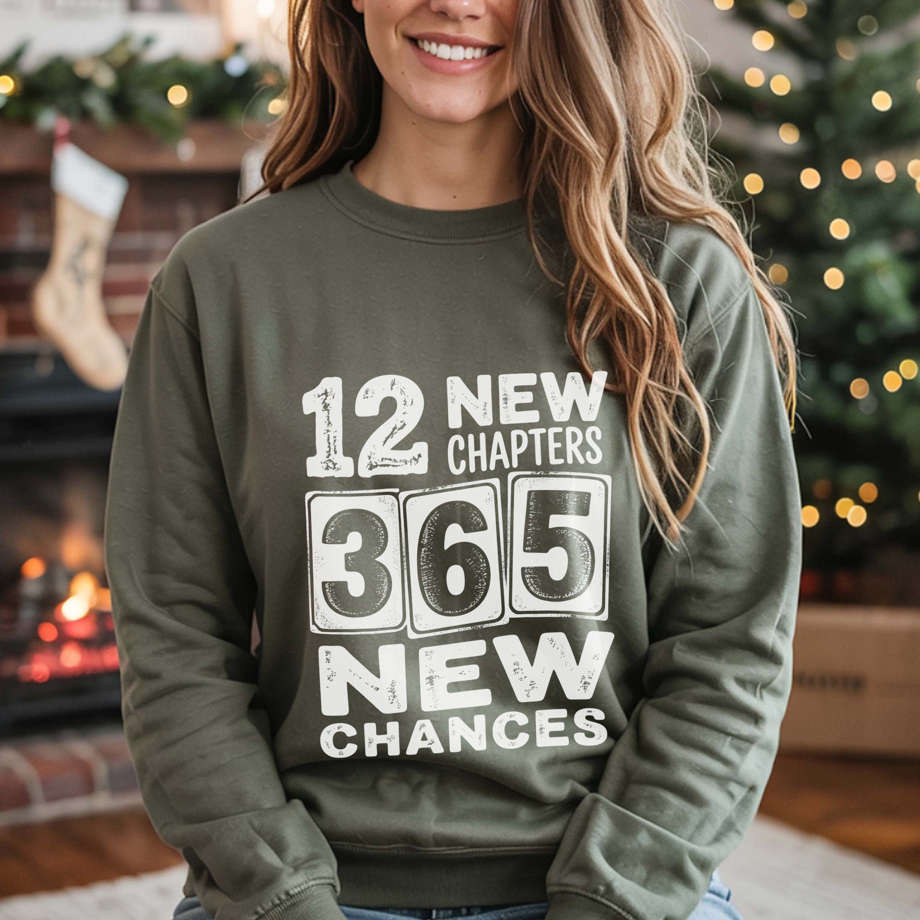 Woman wearing green Cheers 2026 Crewneck sweatshirt with "12 New Chapters 365 New Chances" text in cozy holiday setting