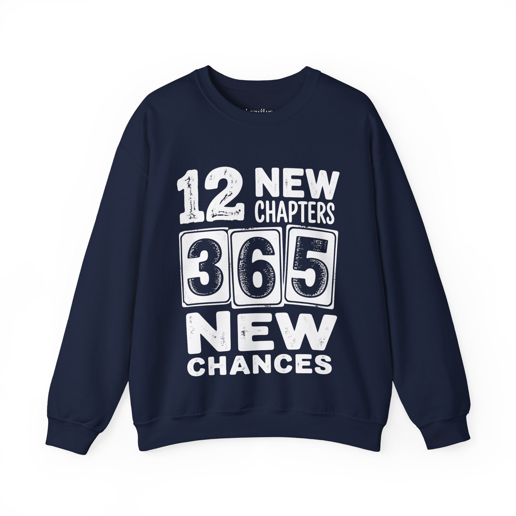 Navy blue Cheers 2026 Crewneck sweatshirt with white "12 New Chapters 365 New Chances" text design on front, unisex fleece crewneck.