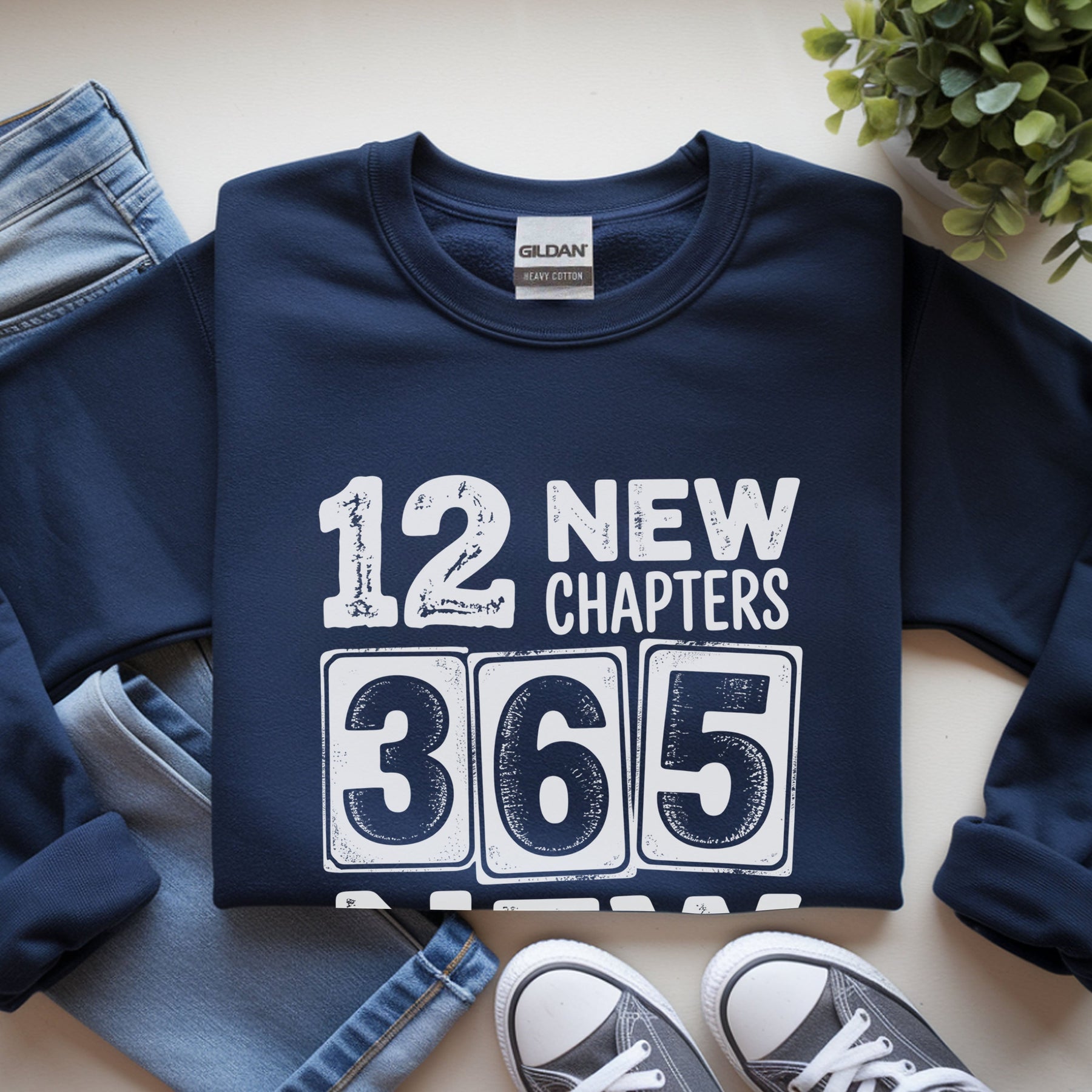 Navy blue Cheers 2026 Crewneck sweatshirt with "12 New Chapters 365 New Chances" varsity-style print on Gildan 18000 fleece, styled with jeans and sneakers.