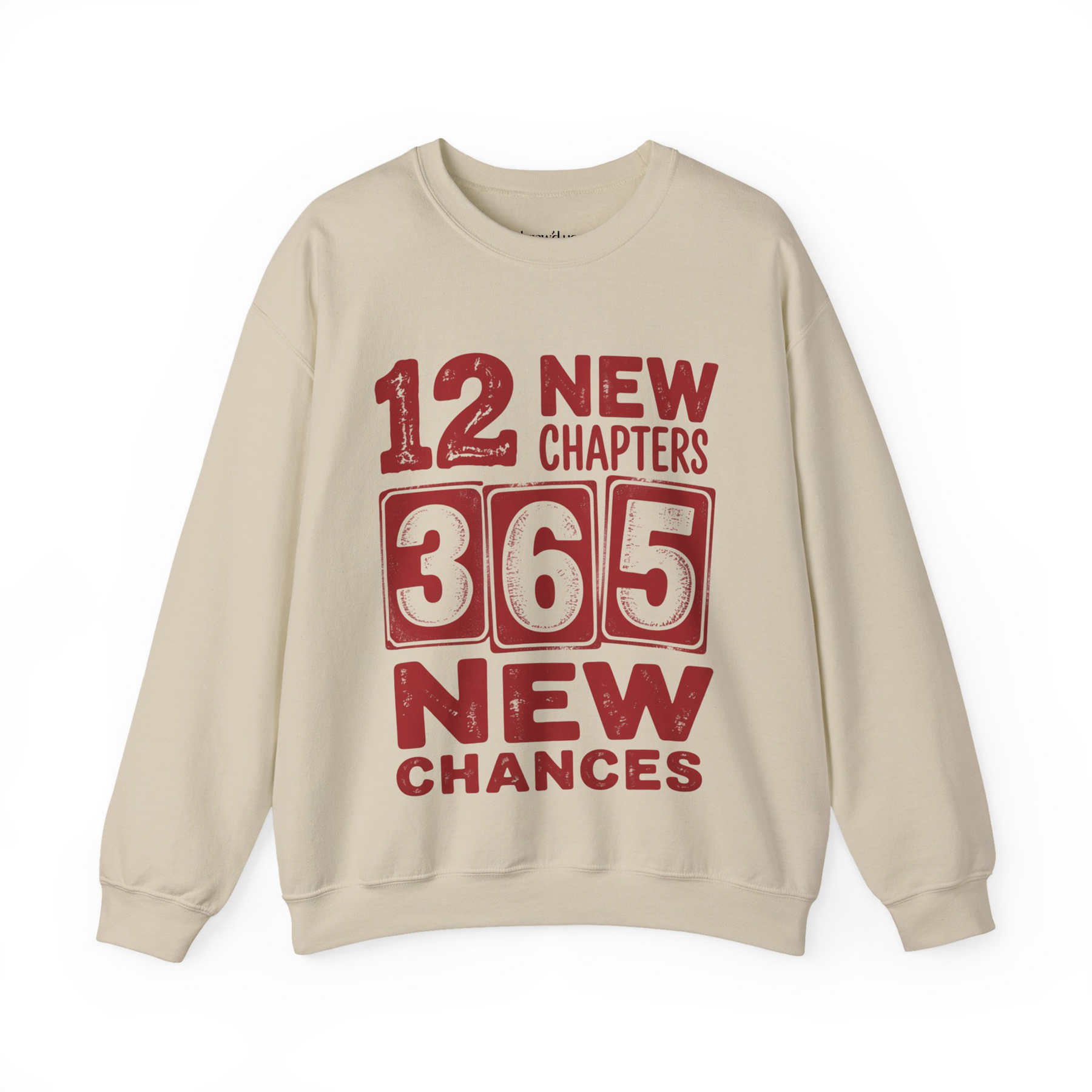 Cheers 2026 Crewneck sweatshirt with 12 new chapters 365 new chances design on beige Gildan 18000 fleece