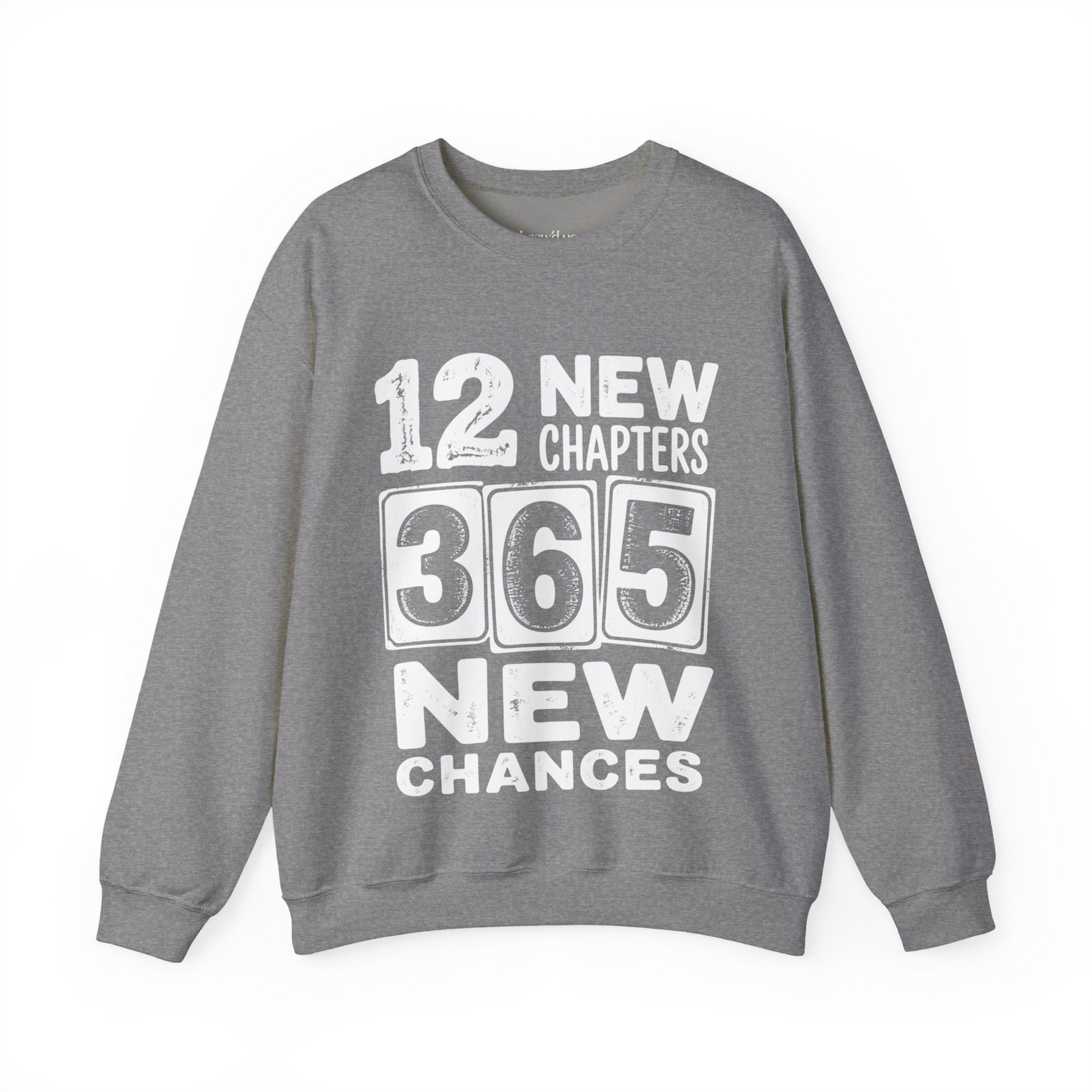 Grey Cheers 2026 Crewneck sweatshirt with "12 New Chapters 365 New Chances" text, Gildan 18000 unisex fleece