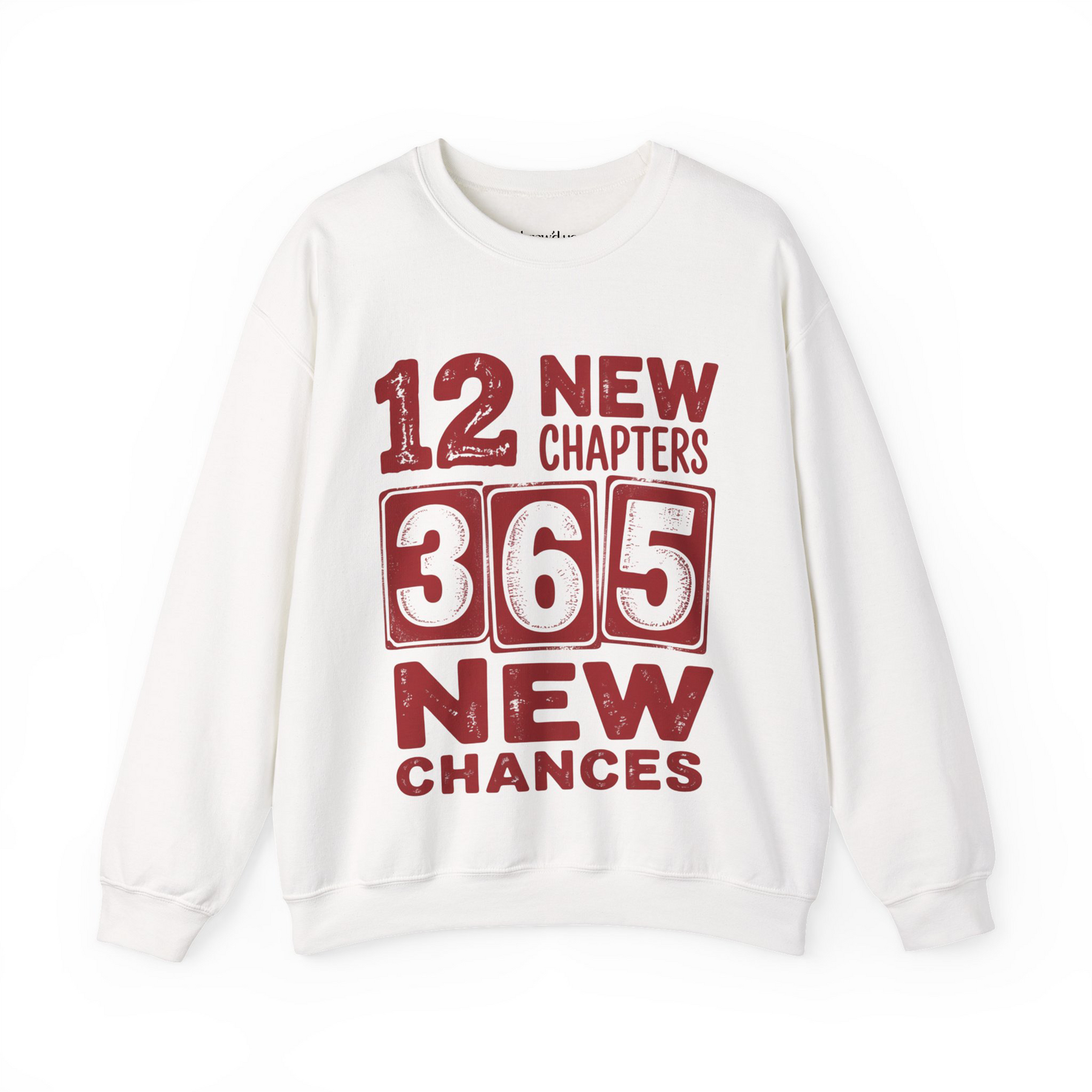White Cheers 2026 Crewneck sweatshirt with "12 New Chapters 365 New Chances" red varsity-style print on Gildan 18000 fleece