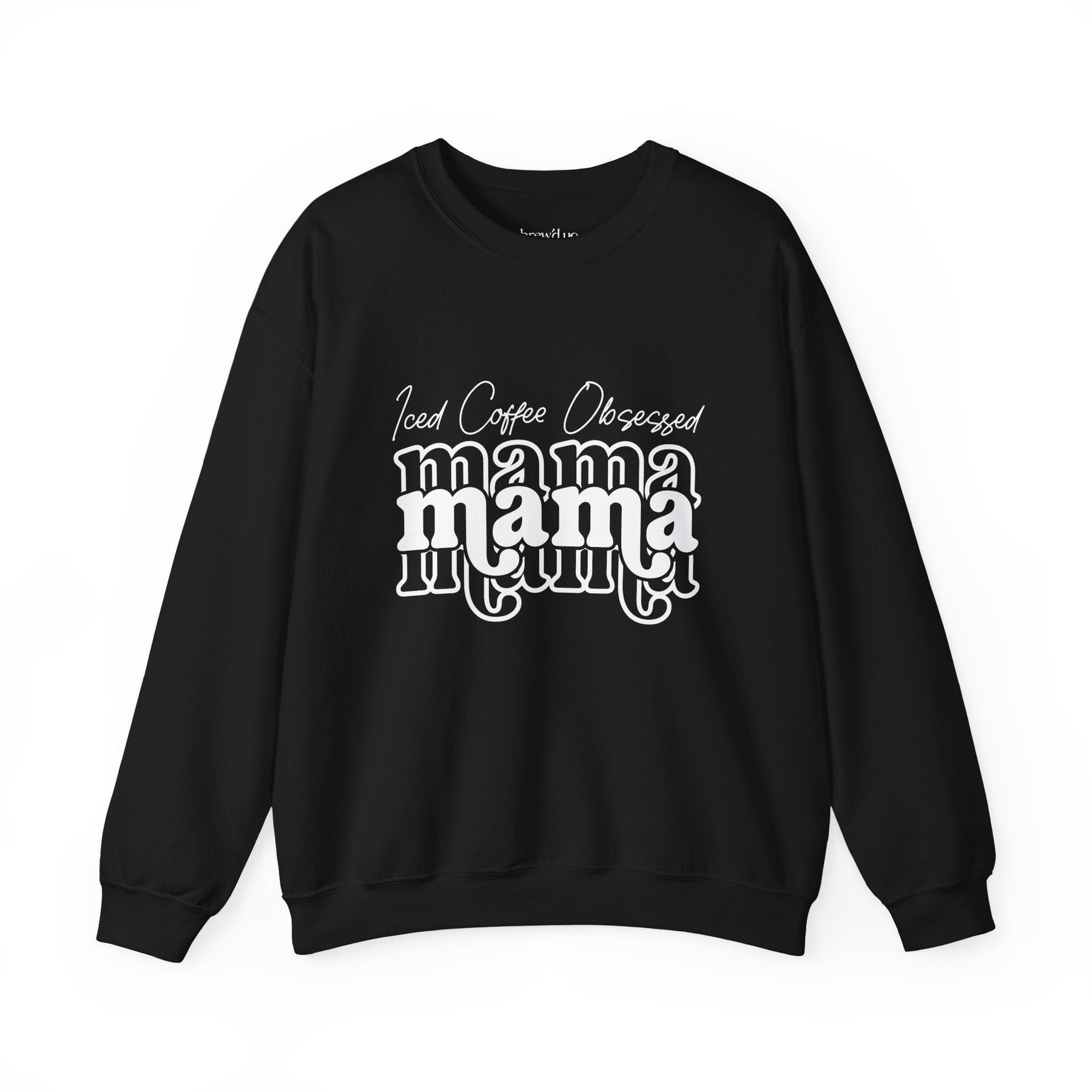 Black crewneck sweatshirt with "Iced Coffee Obsessed mama" white text design, cozy and relaxed fit