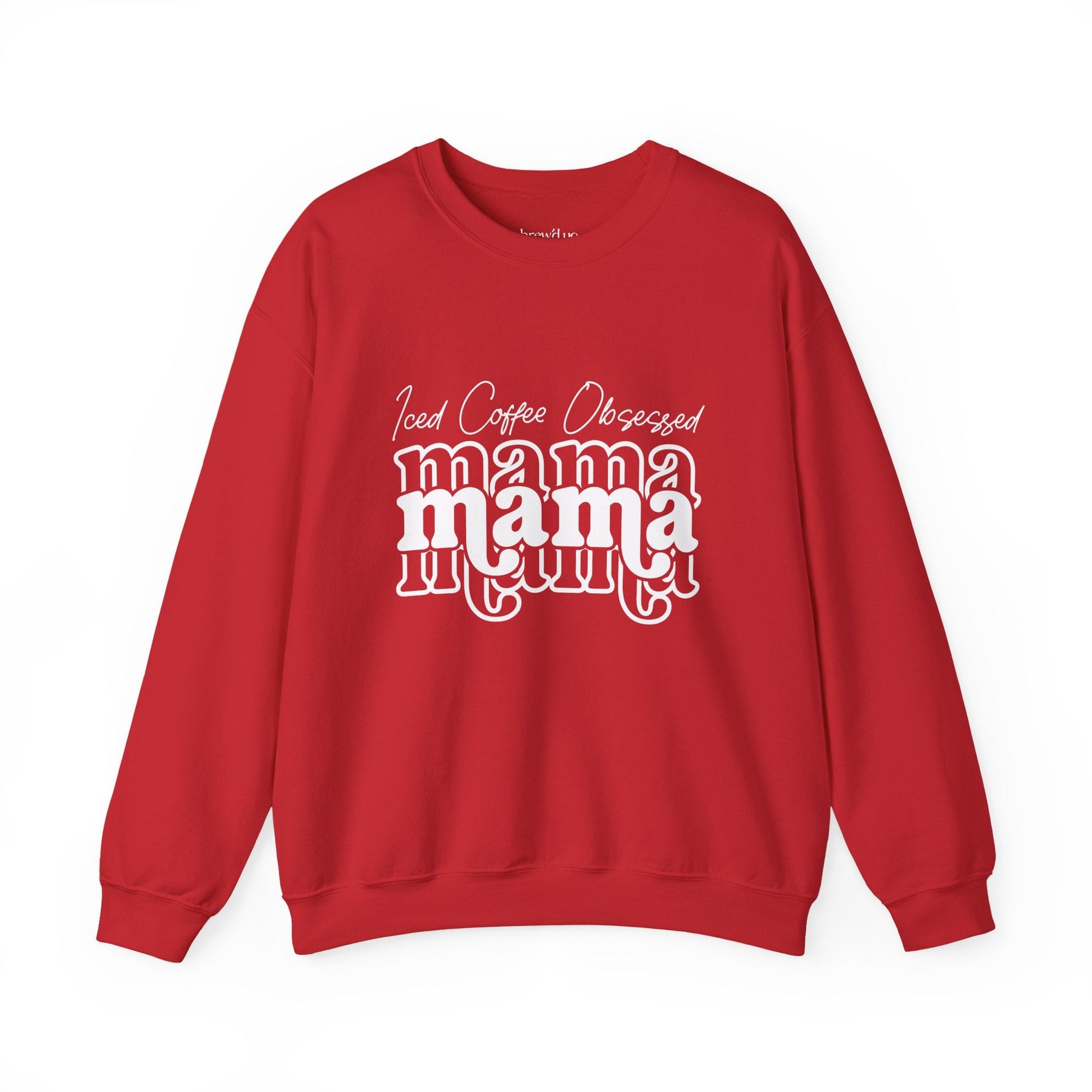 Red Iced Coffee Obsessed Mama crewneck sweatshirt with white text design and casual fit