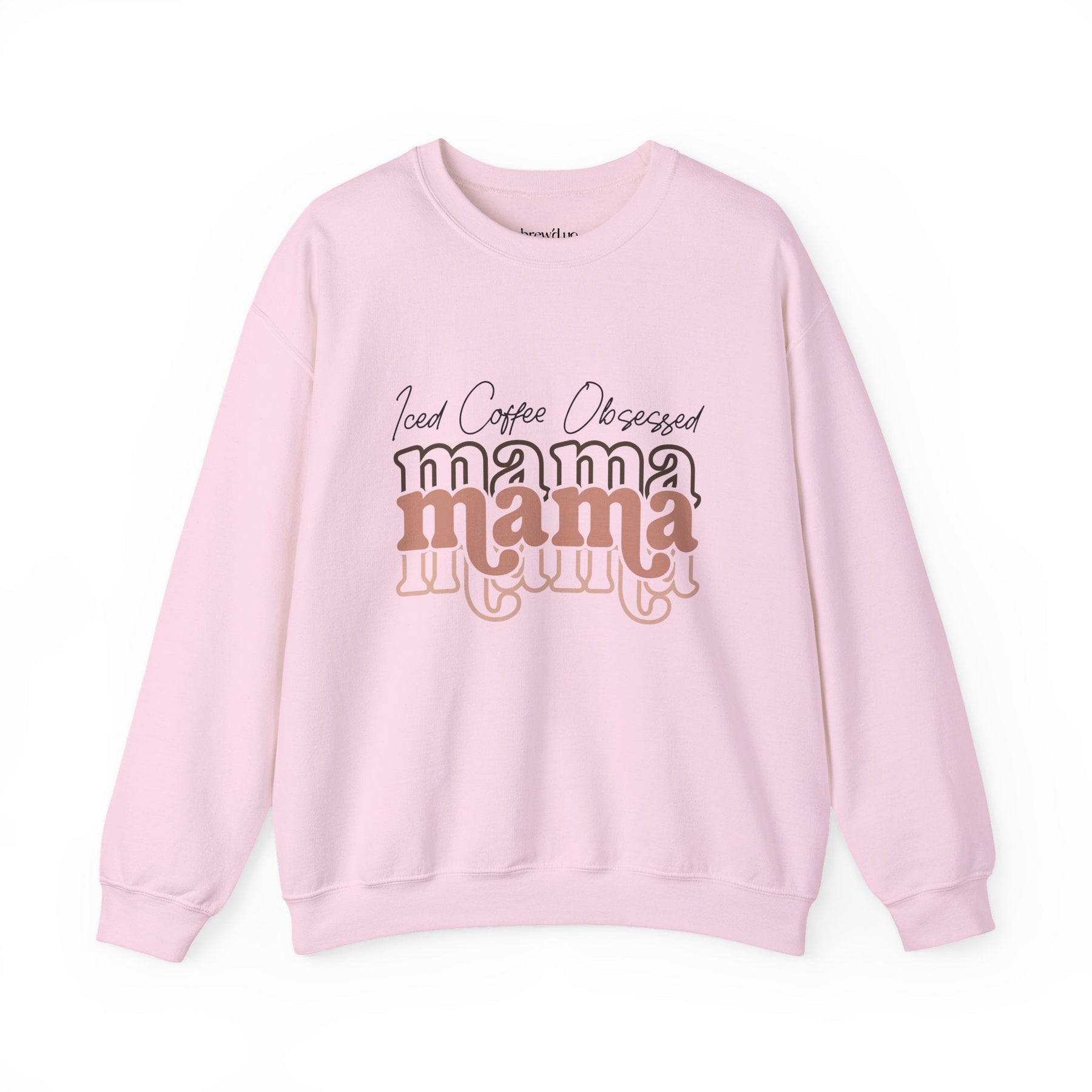 Light pink Iced Coffee Obsessed Mama crewneck sweatshirt with layered text design and ribbed cuffs.