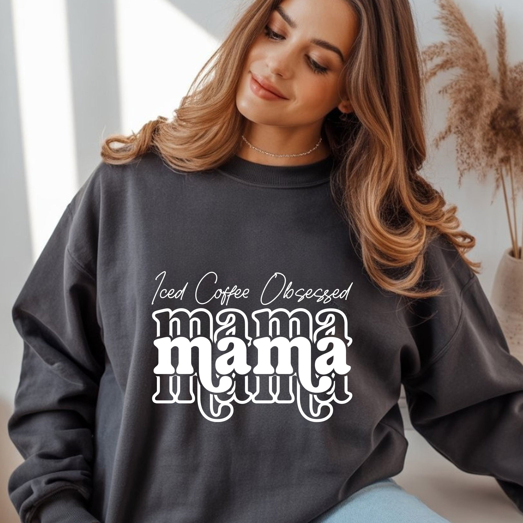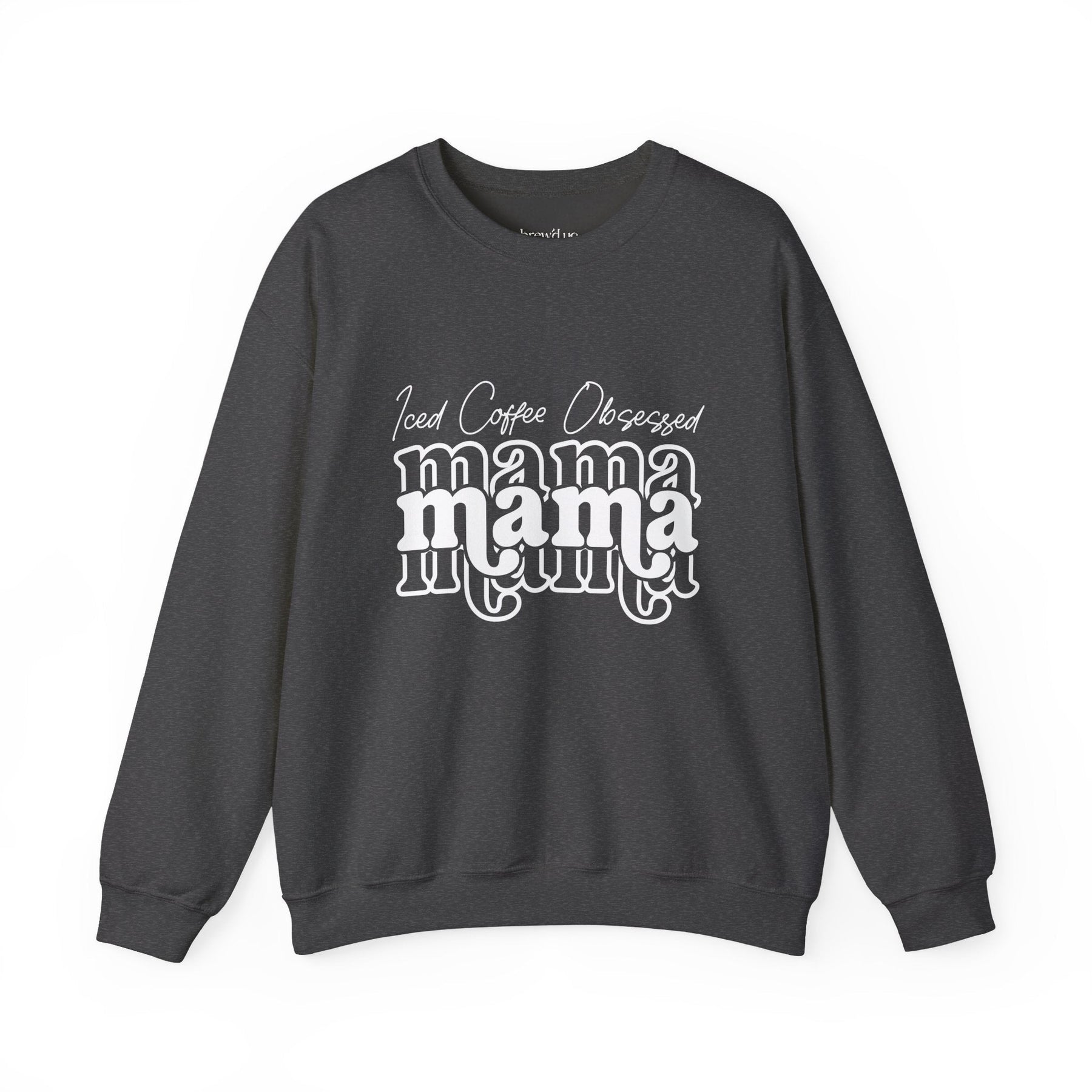 Iced Coffee Obsessed Mama crewneck sweatshirt in dark grey with white graphic text