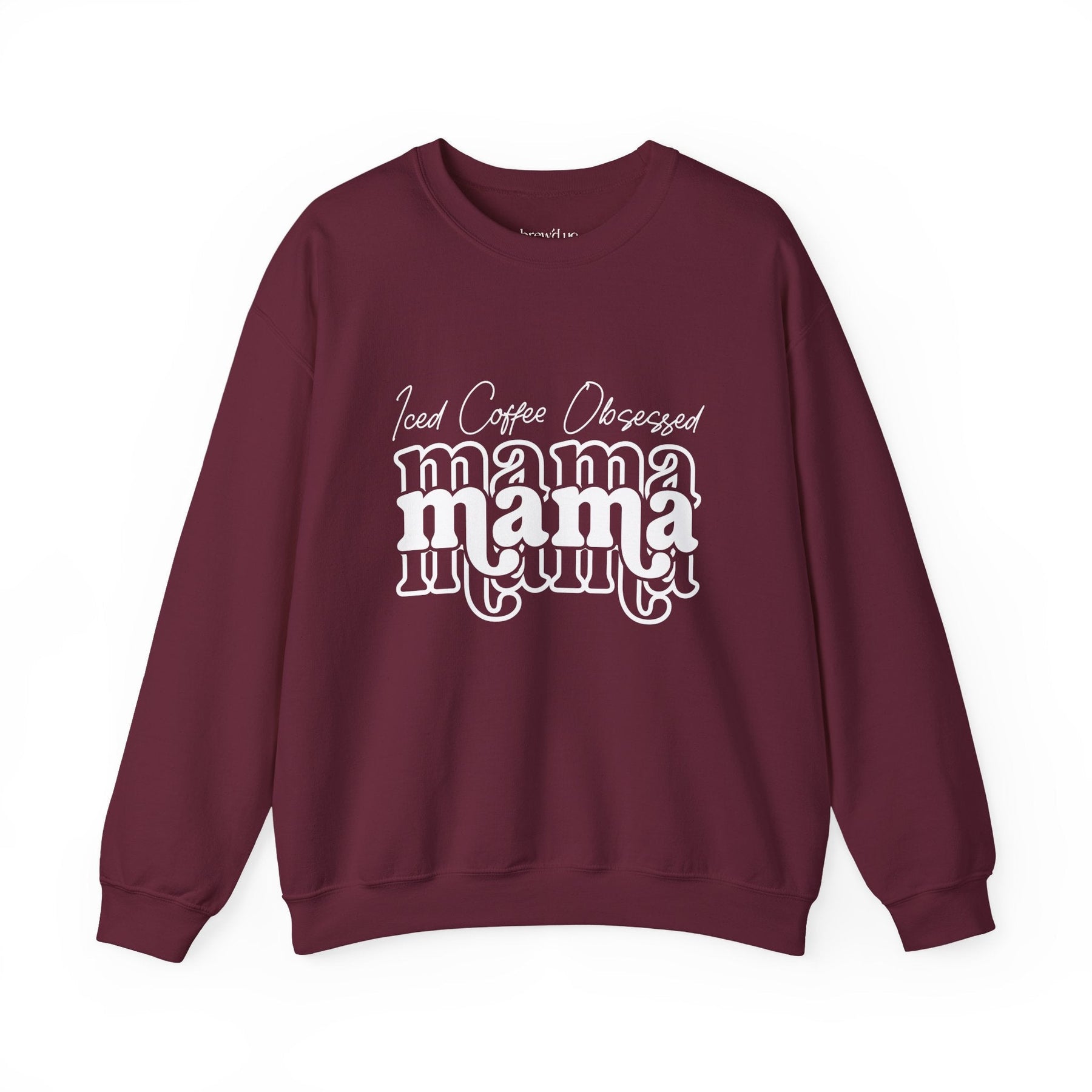 Iced Coffee Obsessed Mama maroon crewneck sweatshirt with white text design