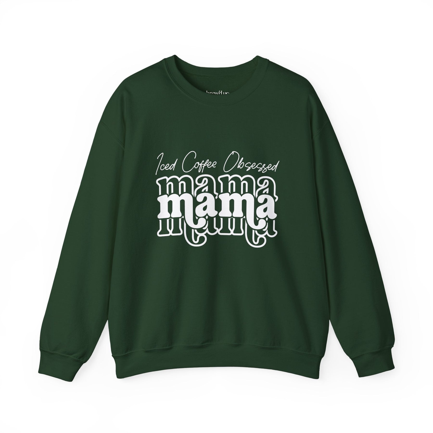 Green crewneck sweatshirt with "Iced Coffee Obsessed mama" text design, cozy medium-heavy blend, relaxed fit
