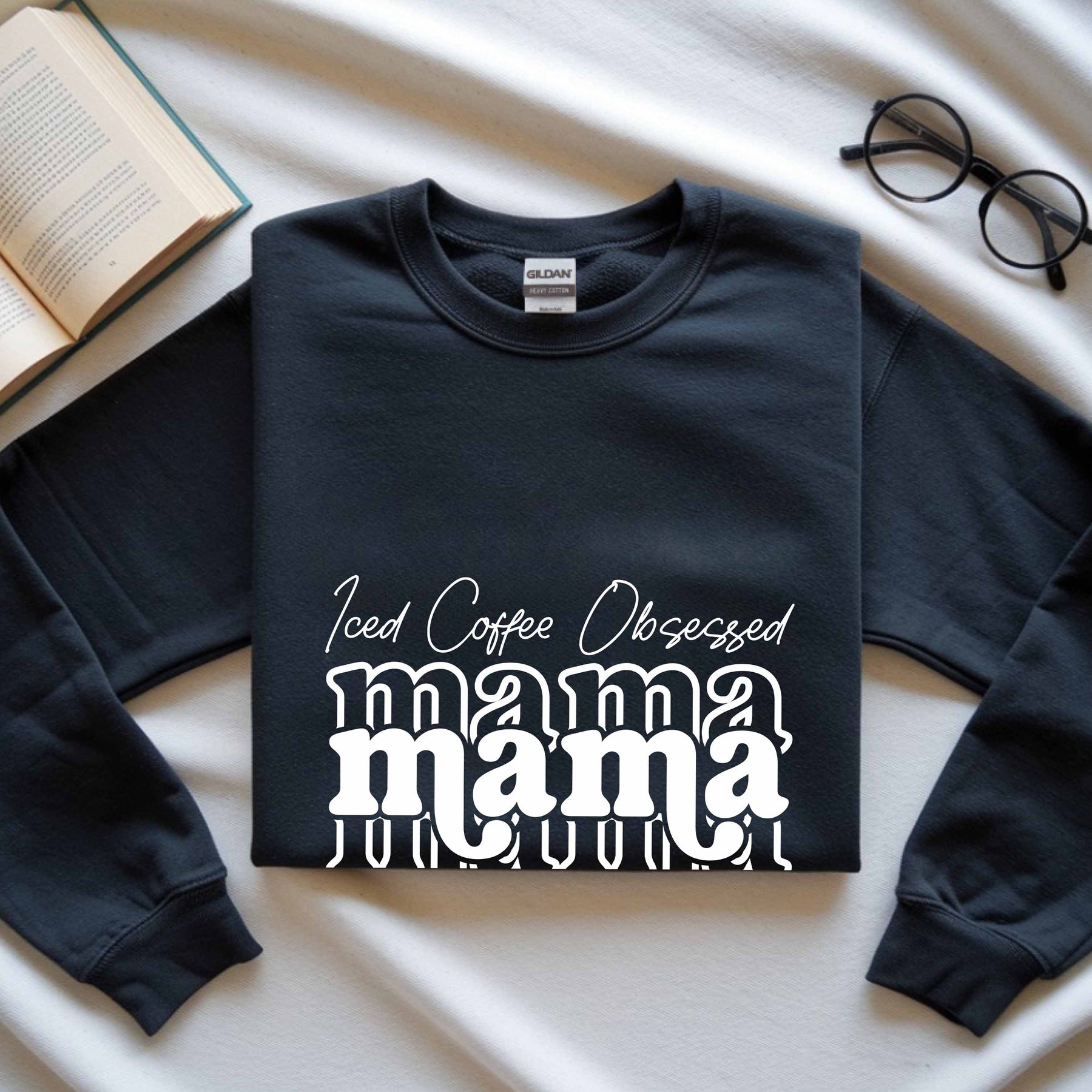 Black Iced Coffee Obsessed Mama crewneck sweatshirt folded on white background with glasses and book nearby