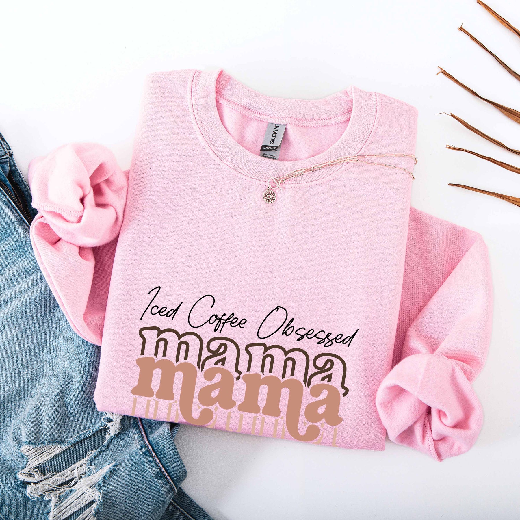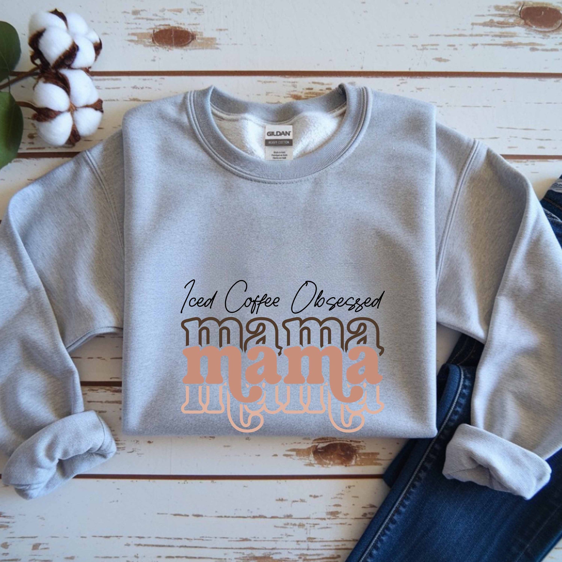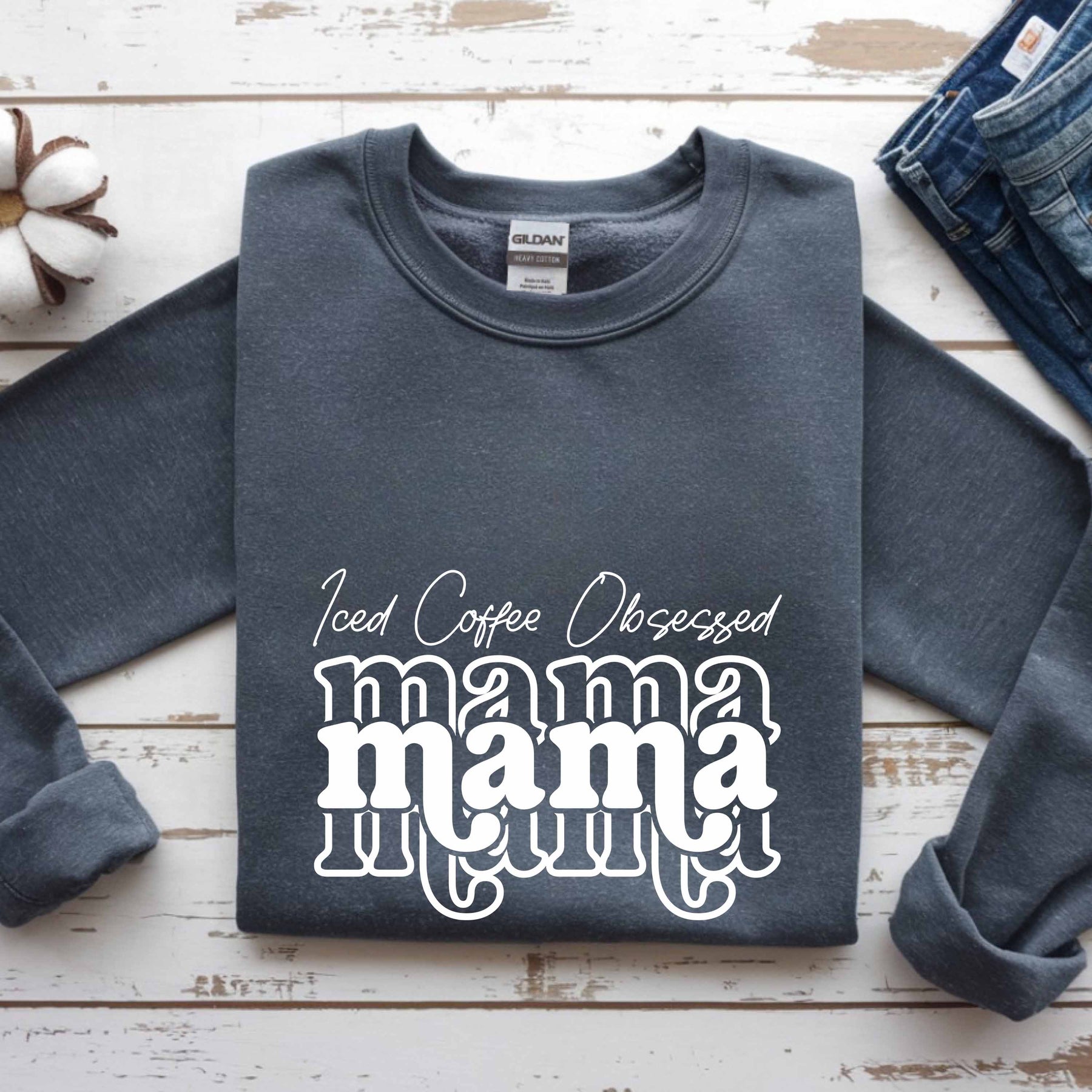 Light grey Iced Coffee Obsessed Mama crewneck sweatshirt folded on wooden background with rolled sleeves and dark jeans nearby