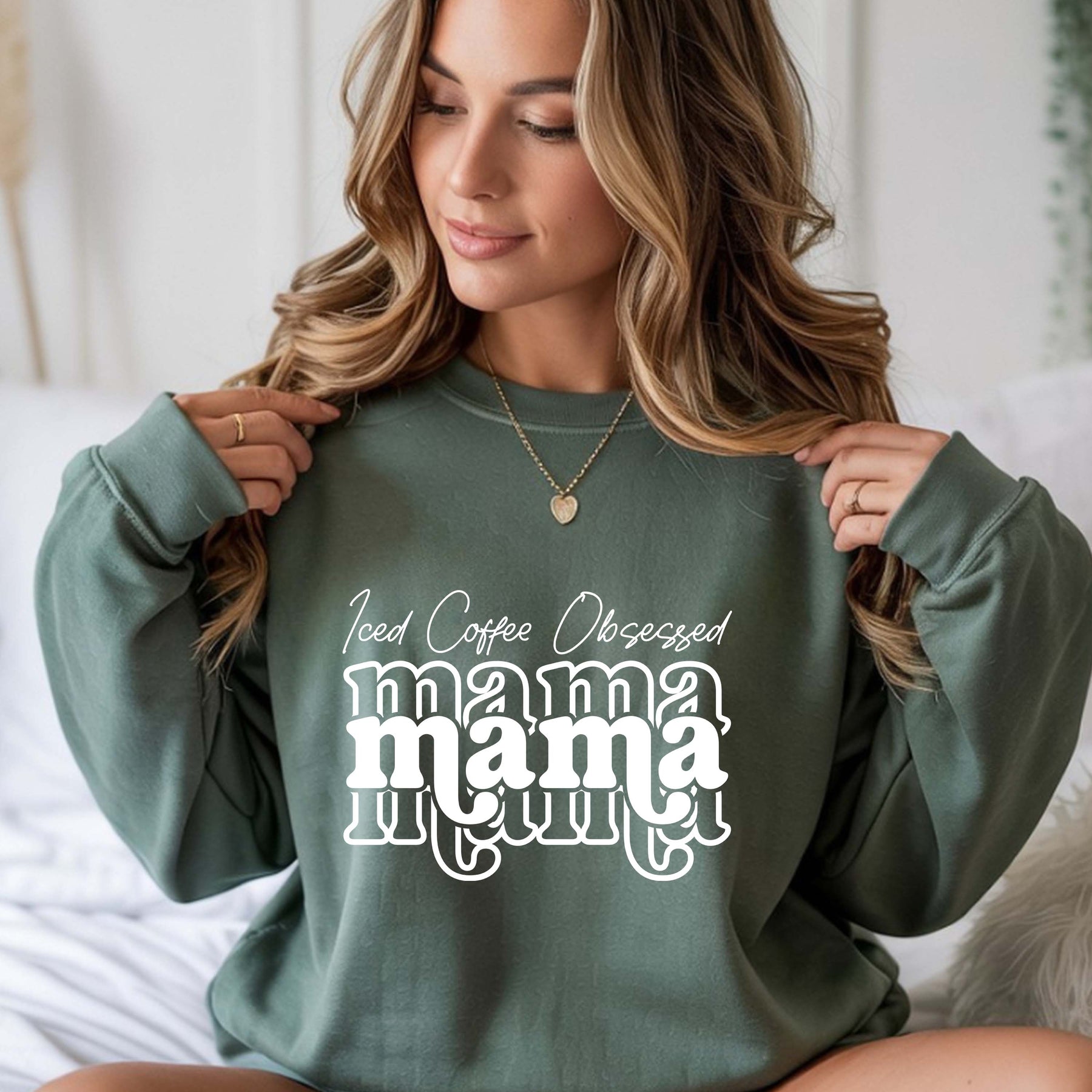 Woman wearing green Iced Coffee Obsessed Mama crewneck sweatshirt with white text design