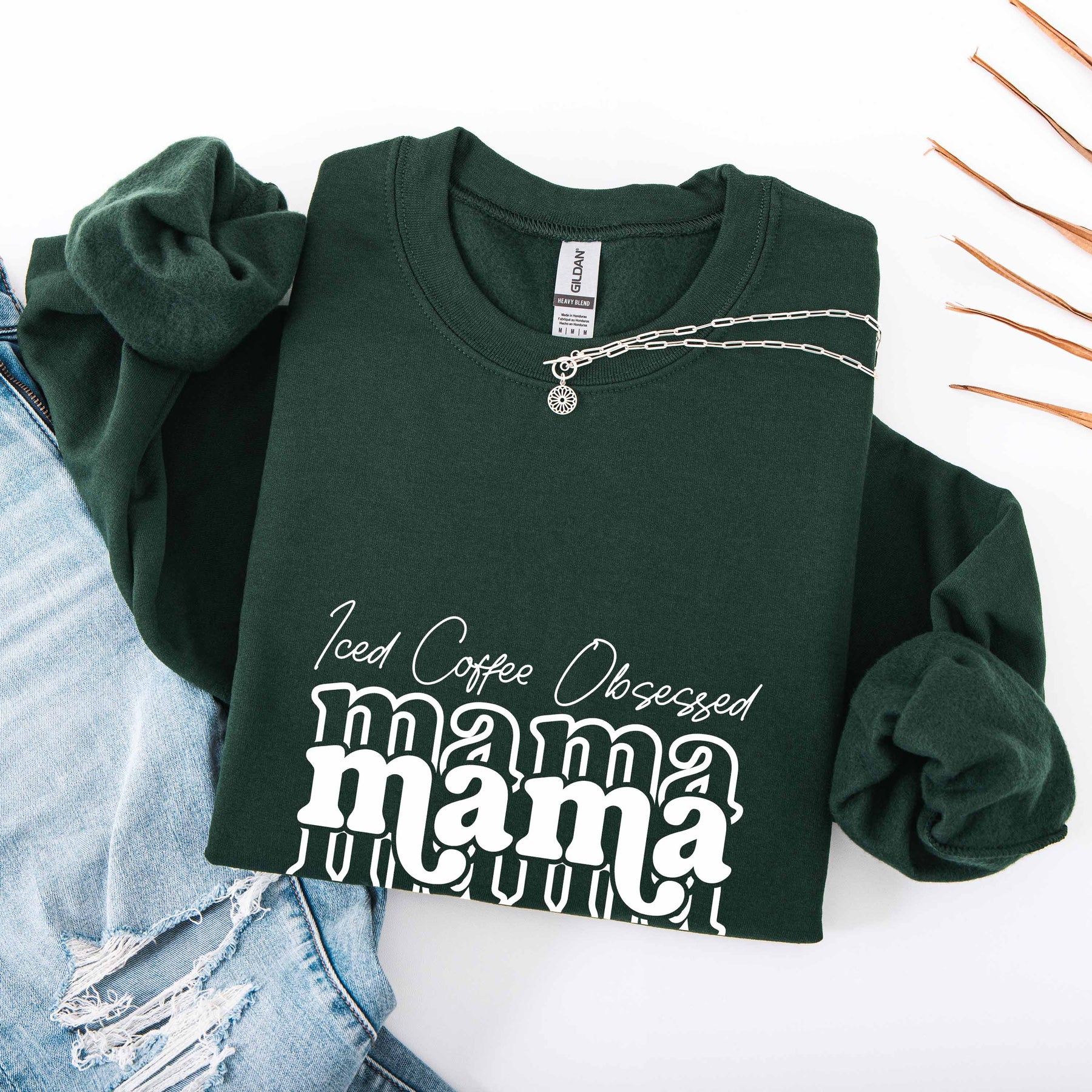 Dark green Iced Coffee Obsessed Mama crewneck sweatshirt with white text, styled with blue ripped jeans and a silver necklace.