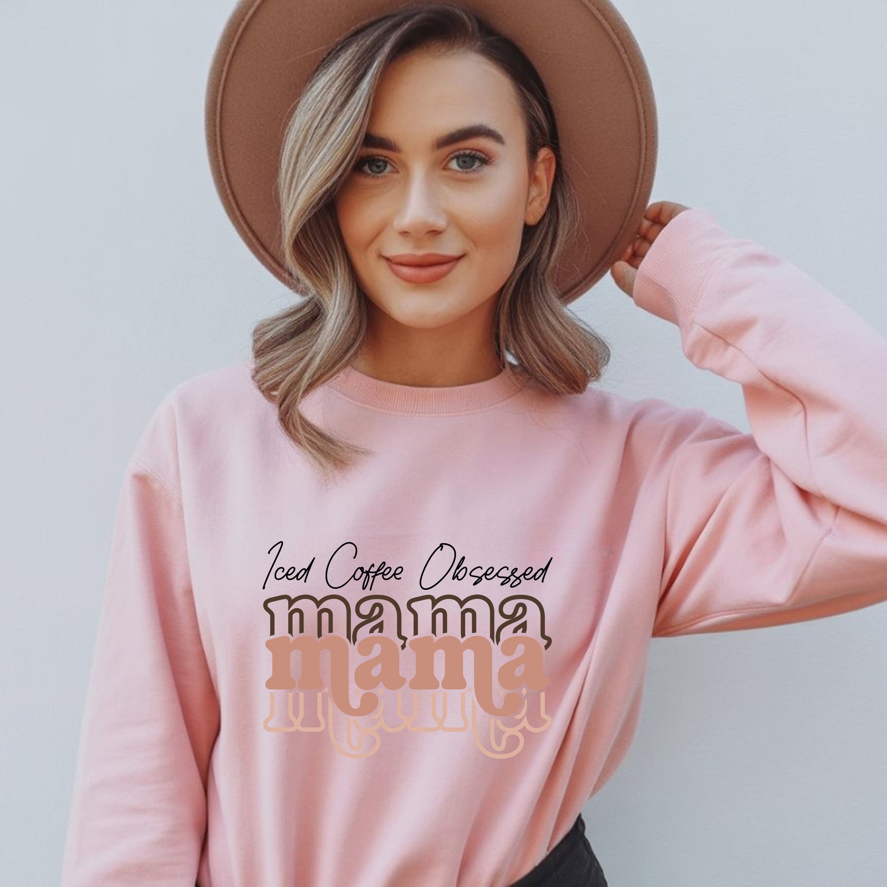 Woman wearing pink Iced Coffee Obsessed Mama crewneck sweatshirt and brown hat