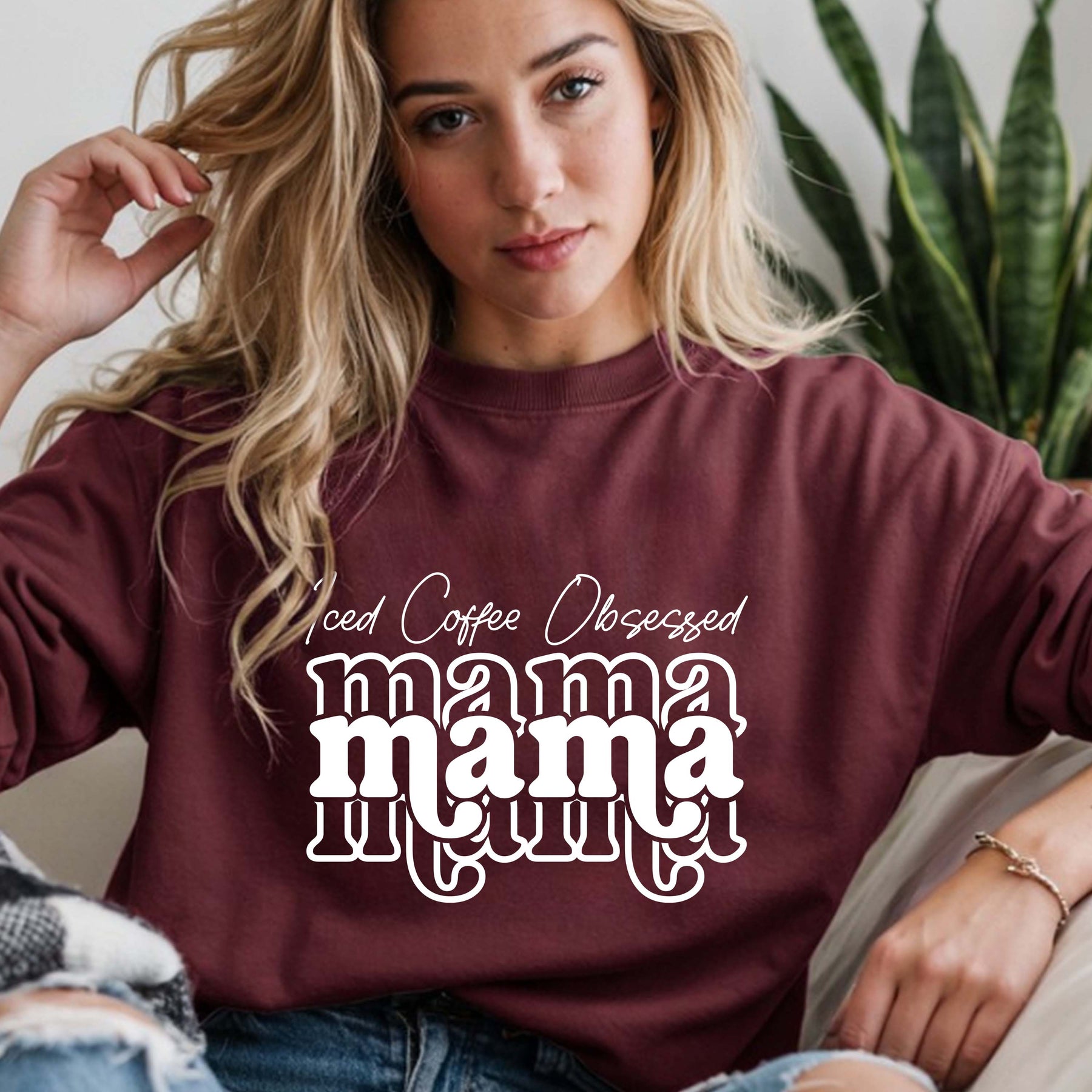 woman wearing maroon iced coffee obsessed mama crewneck sweatshirt sitting indoors