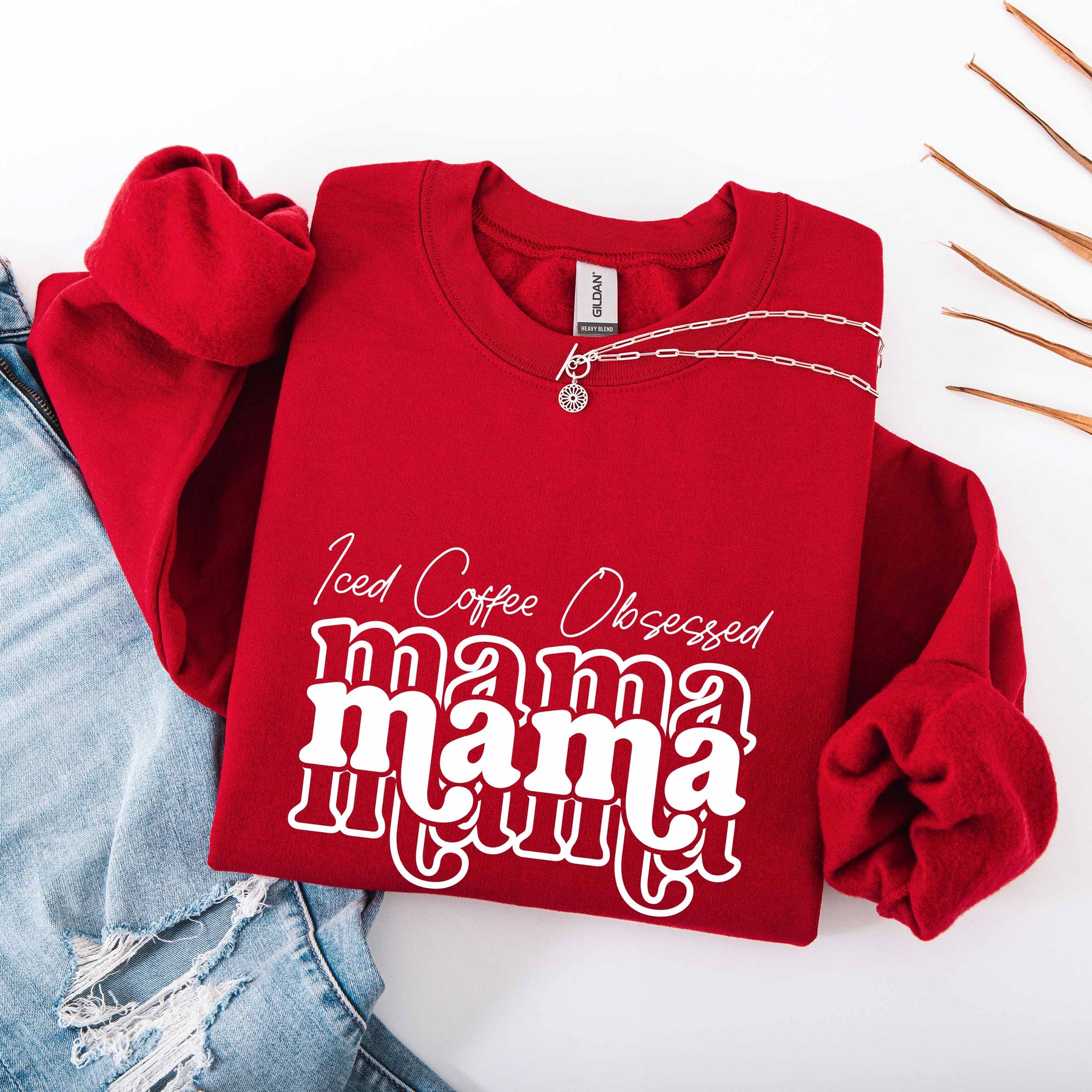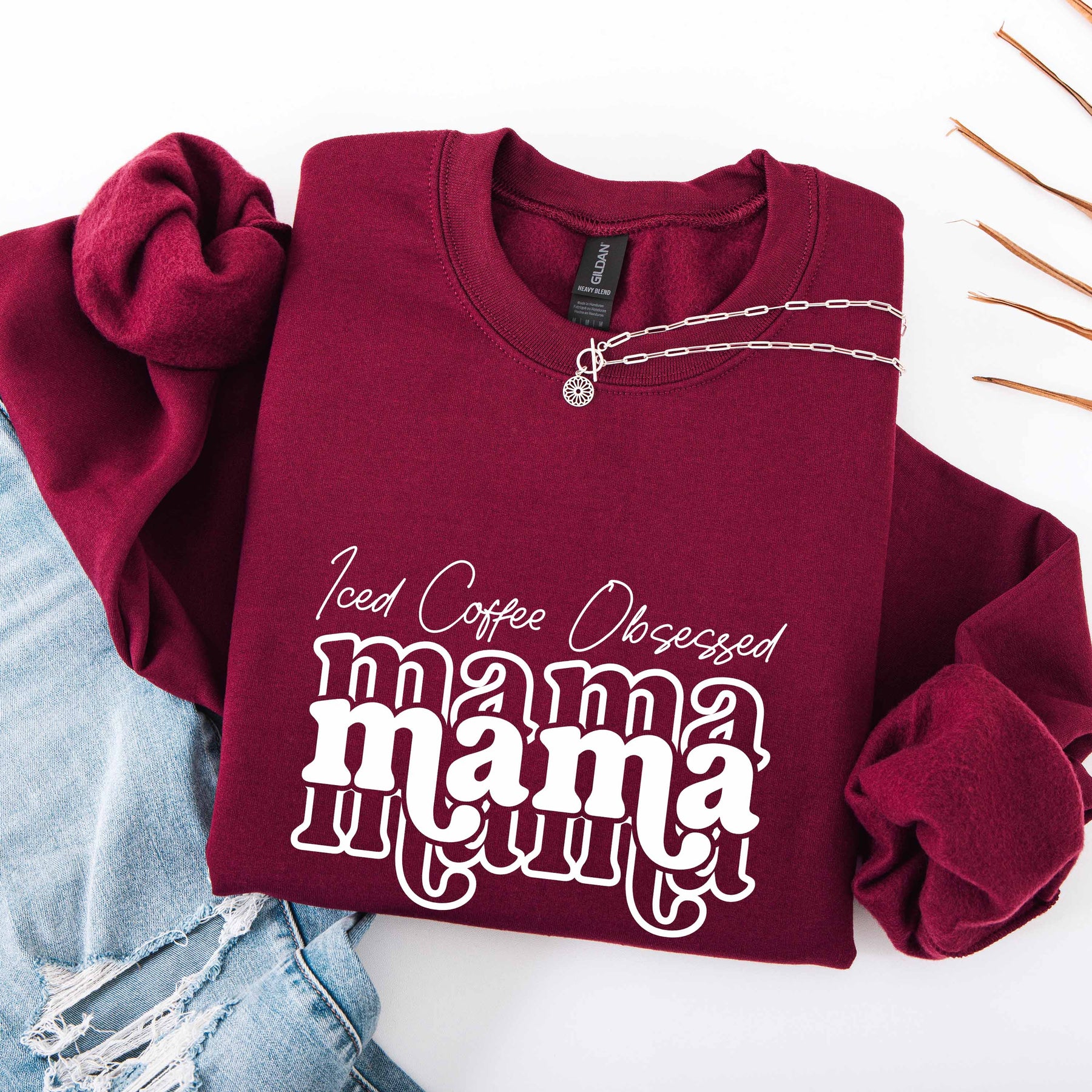Burgundy Iced Coffee Obsessed Mama crewneck sweatshirt with white text and layered mama print, folded with denim jeans and silver necklace.