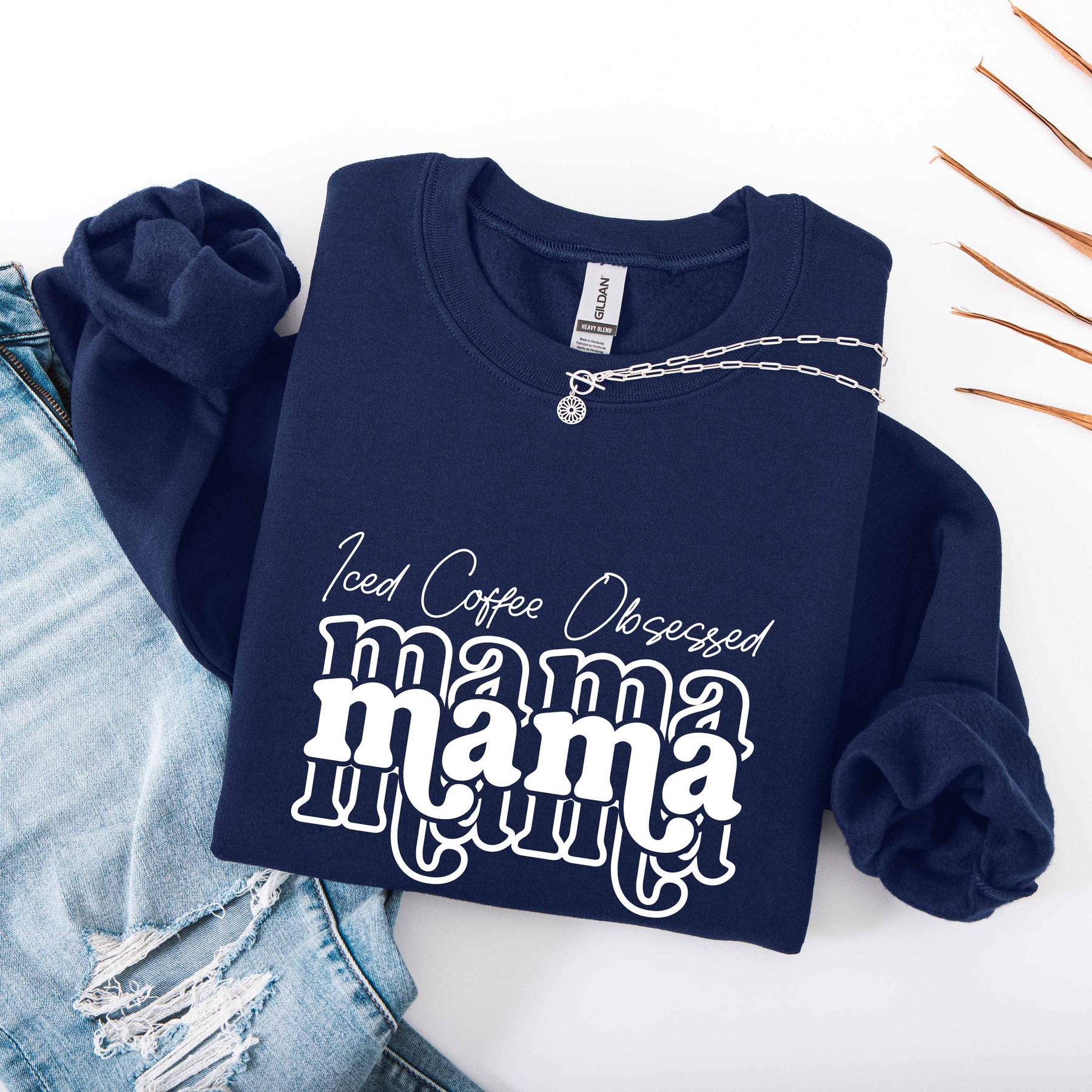 Navy blue Iced Coffee Obsessed Mama crewneck sweatshirt with white text design and rolled sleeves next to light blue ripped jeans and silver necklace on white background