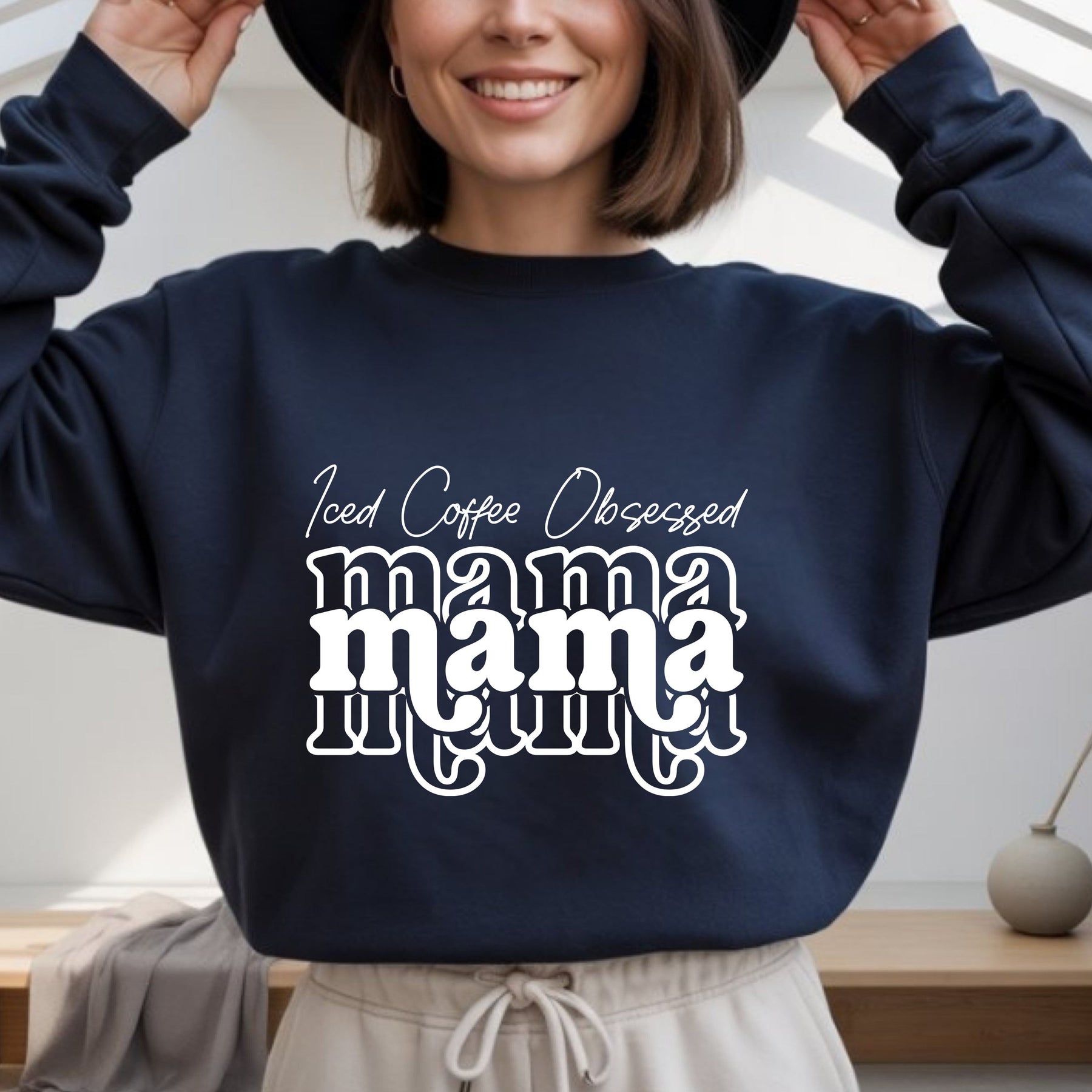 Navy crewneck sweatshirt with "Iced Coffee Obsessed mama" white text design, cozy casual wear