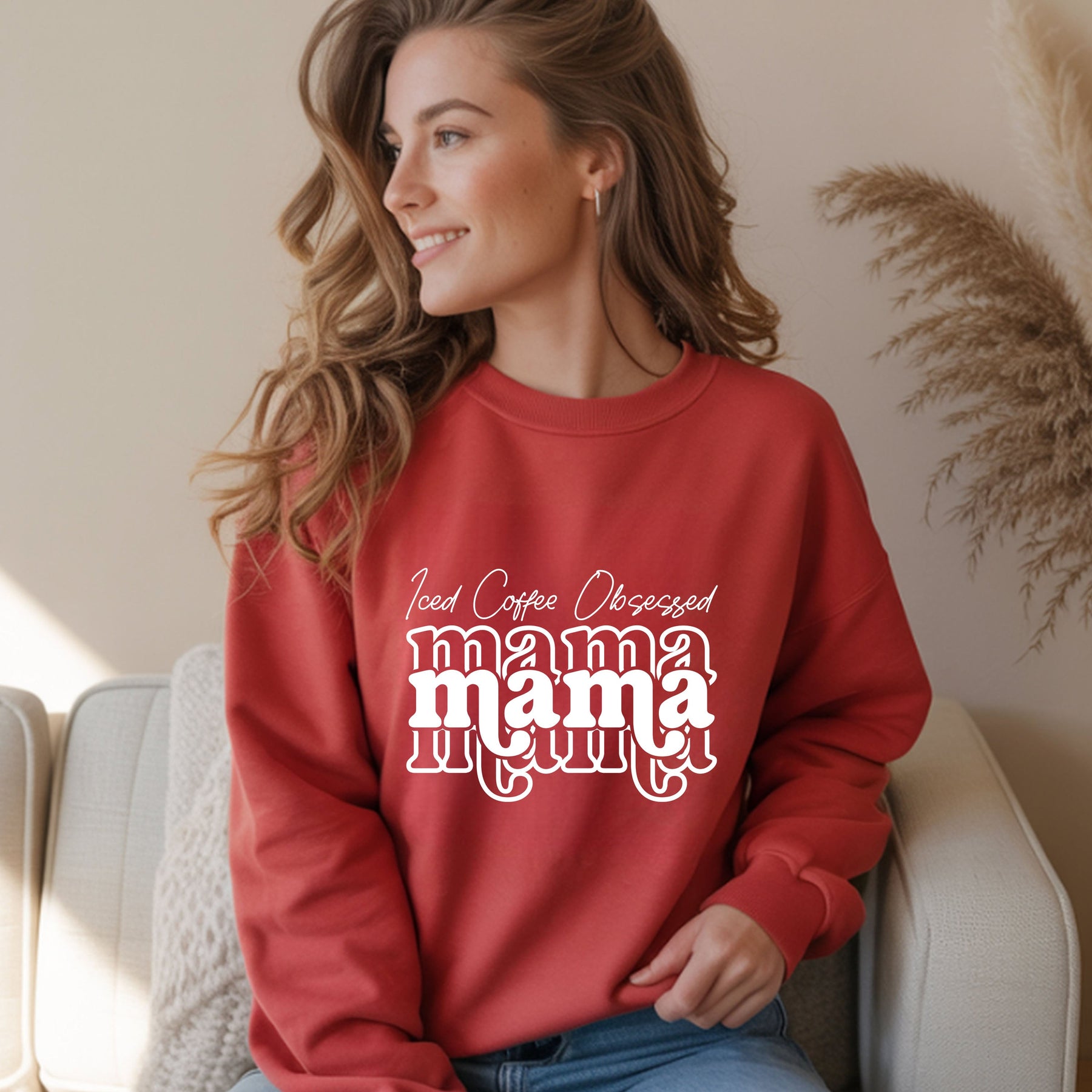 woman wearing red Iced Coffee Obsessed Mama crewneck sweatshirt sitting on beige sofa