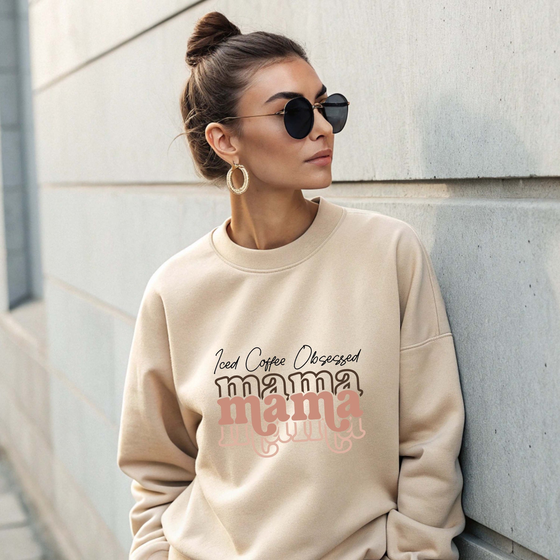 Woman wearing beige Iced Coffee Obsessed Mama crewneck sweatshirt with sunglasses outdoors