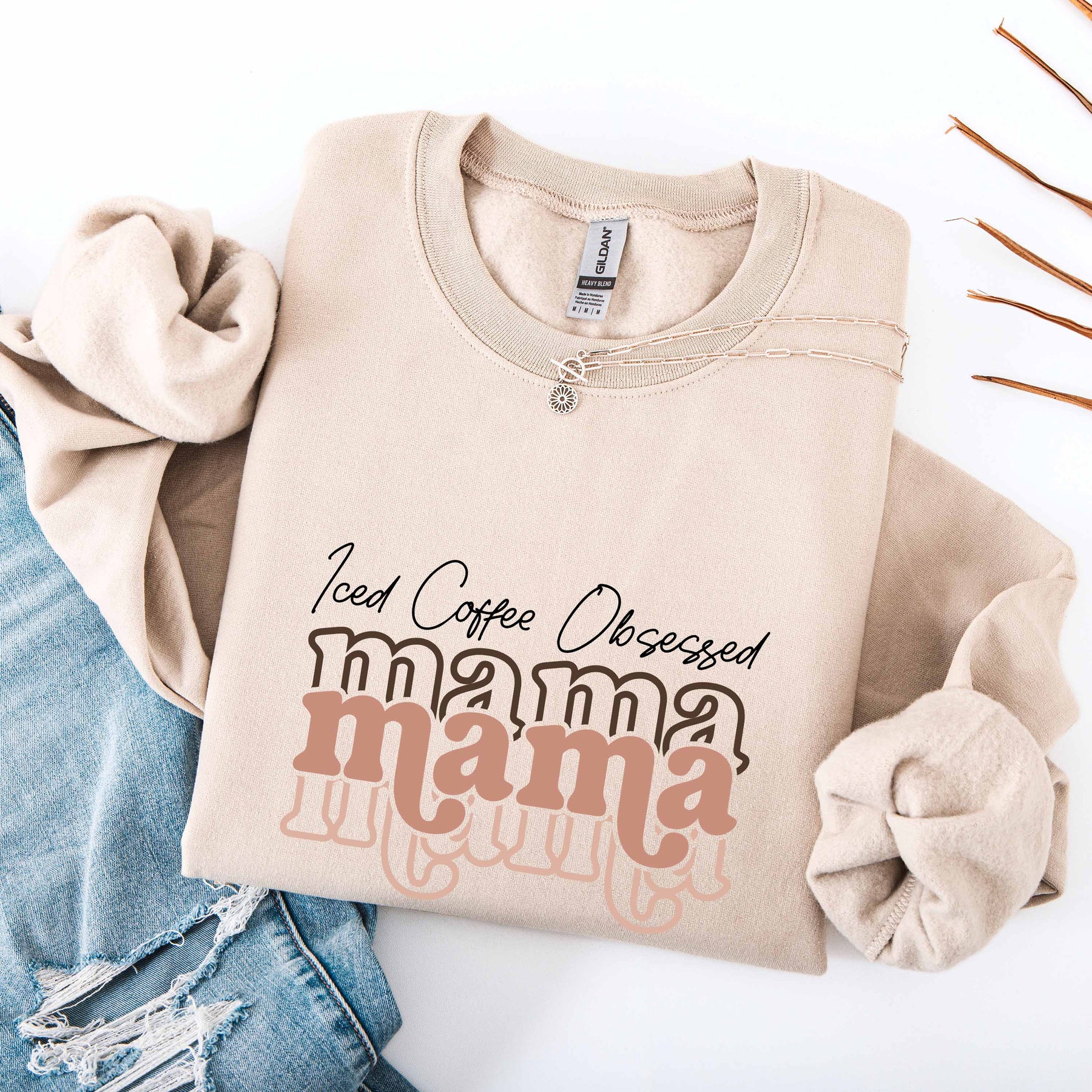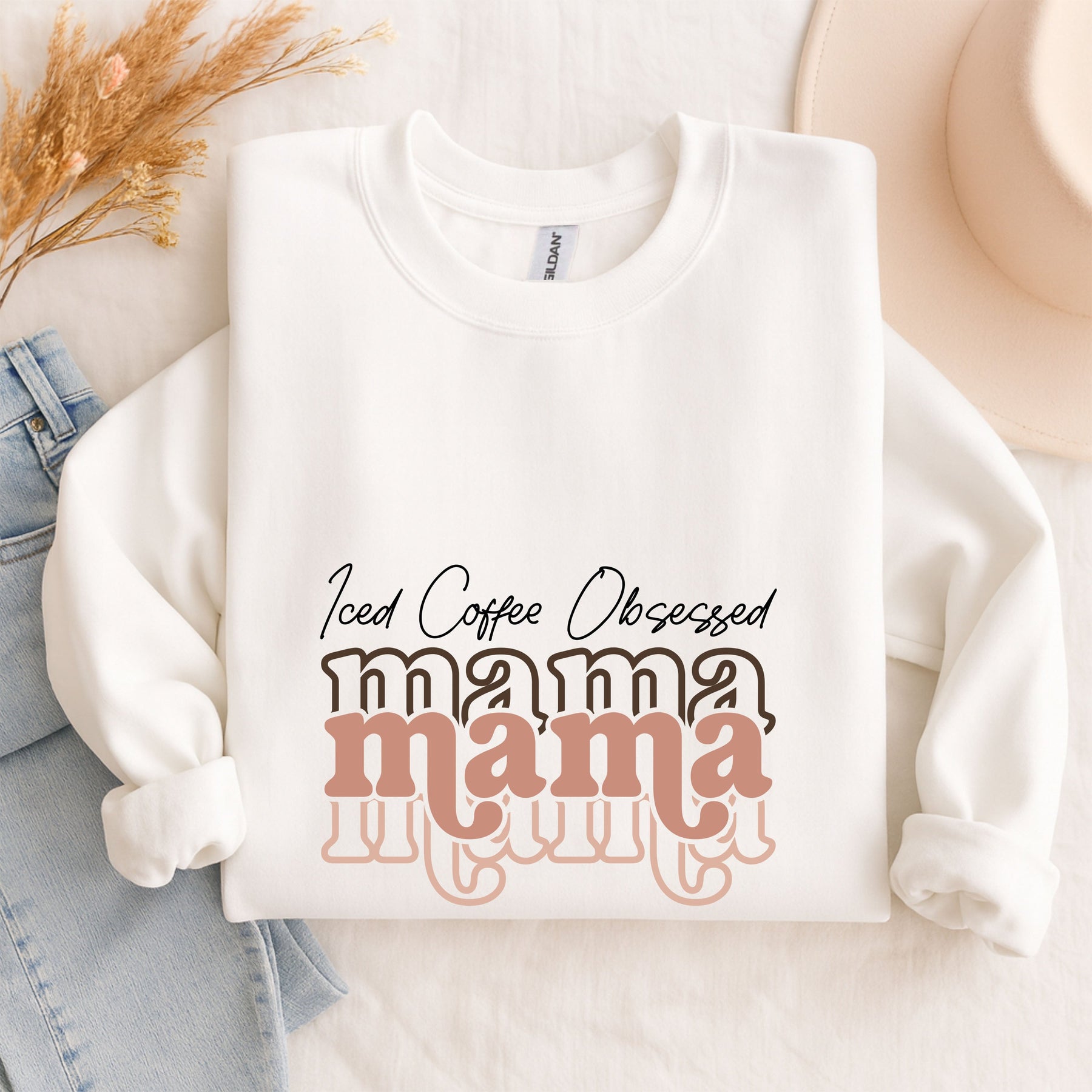 Beige Iced Coffee Obsessed Mama crewneck sweatshirt with layered text design, styled with casual denim and accessories.