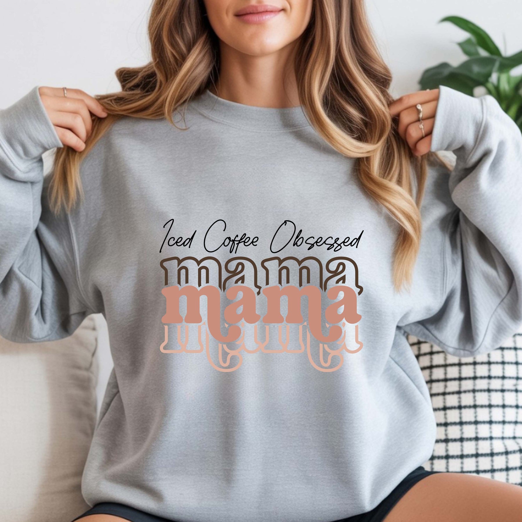 Woman wearing light gray Iced Coffee Obsessed Mama crewneck sweatshirt with layered text design