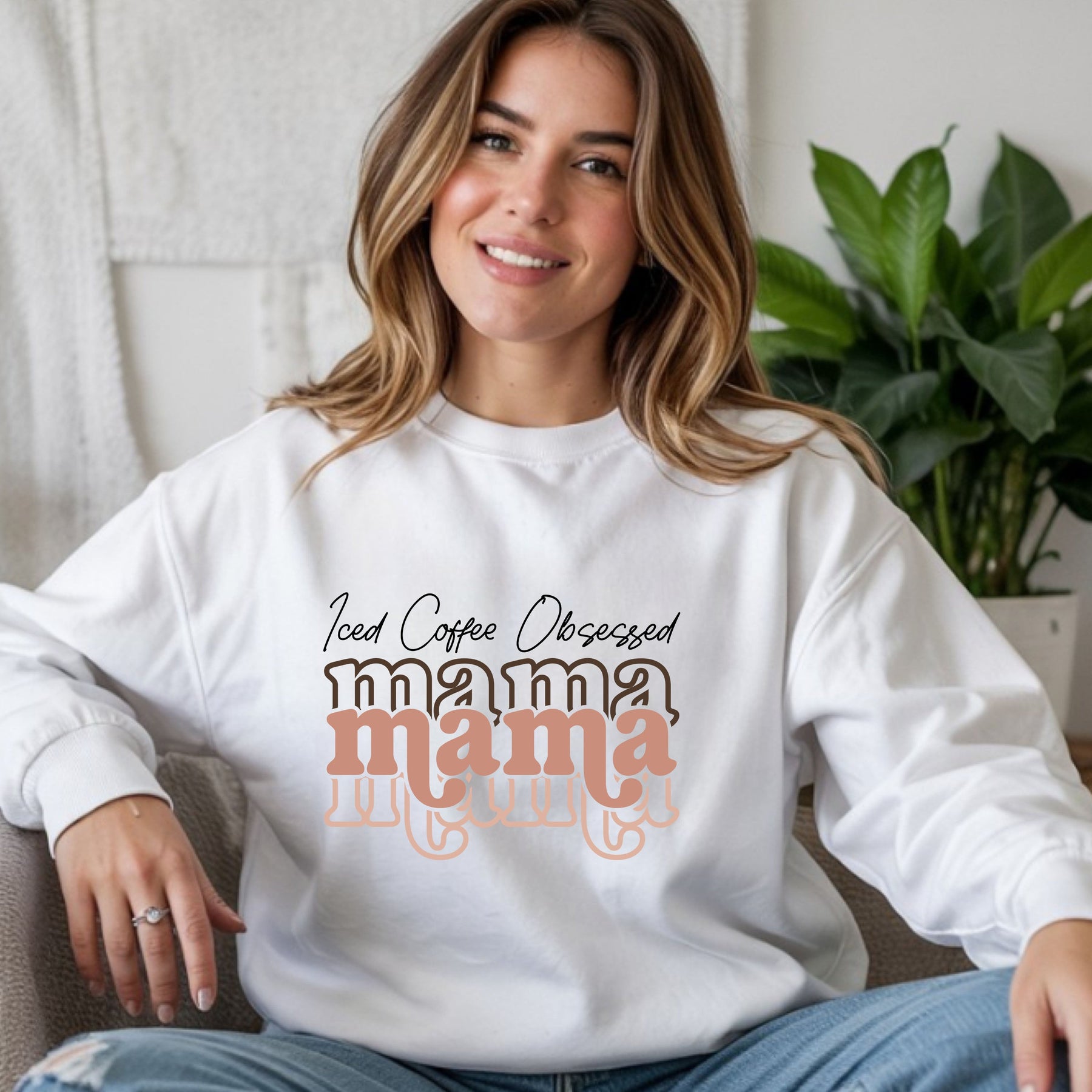 Woman wearing white Iced Coffee Obsessed Mama crewneck sweatshirt sitting indoors with plants in the background