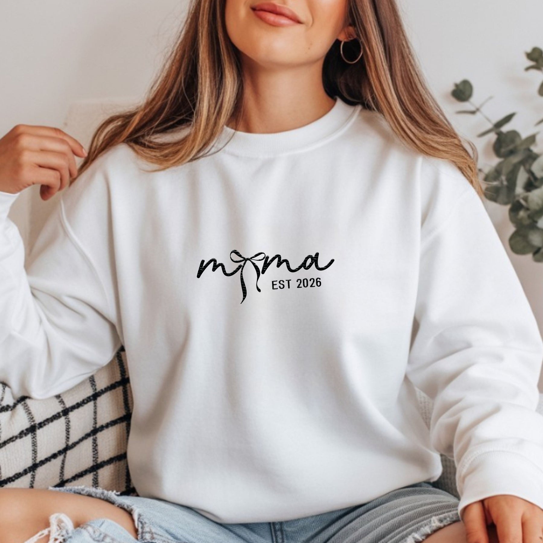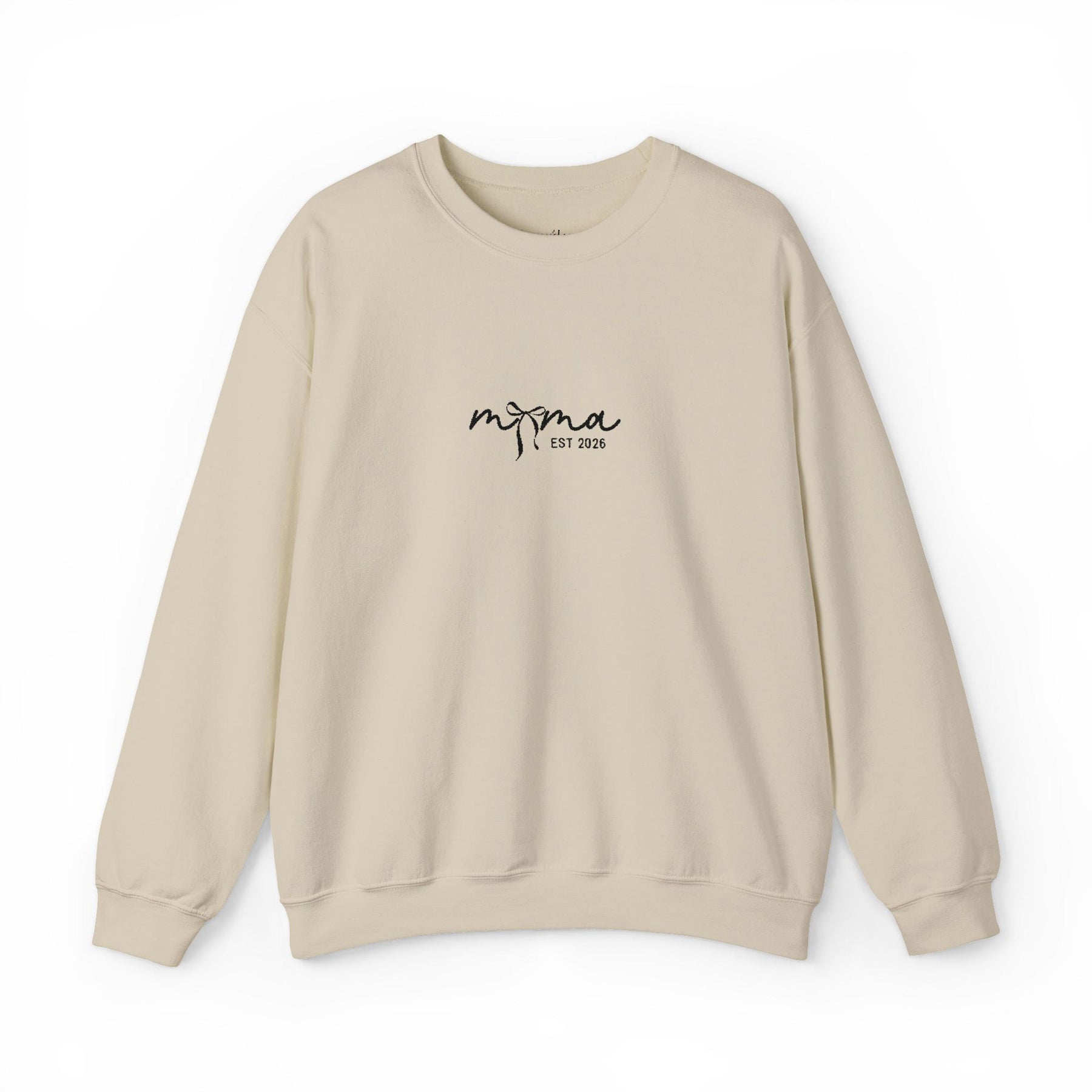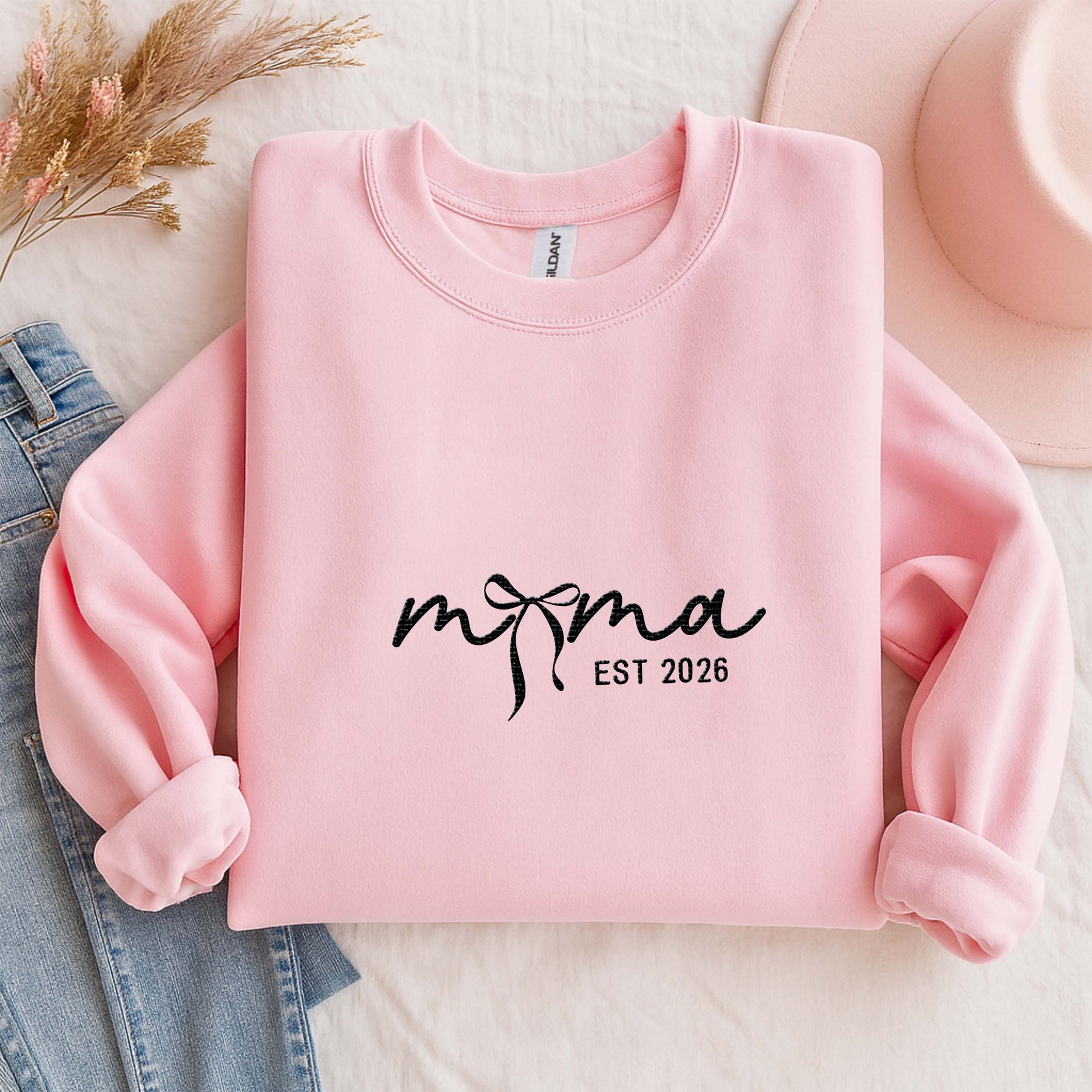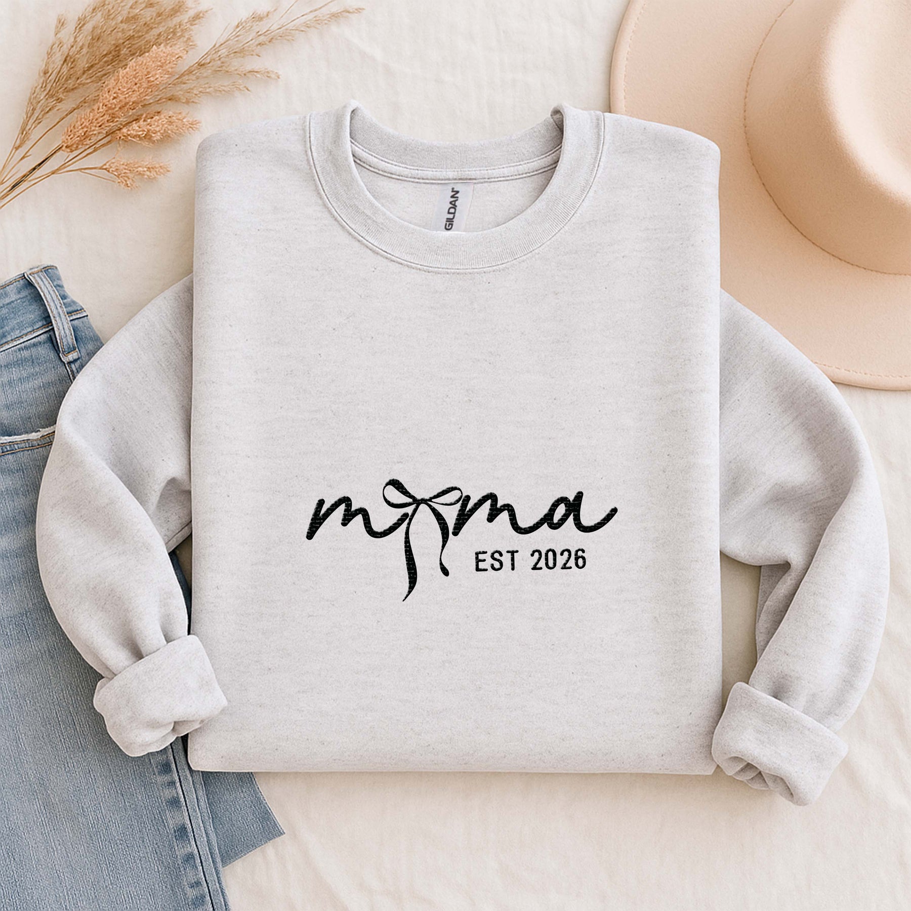 Embroidered Mama EST 2026 Coquette Bow Crewneck | Gildan 18000 | Embroidery Mom Sweatshirt, New Mom Gift, Pregnancy Announcement