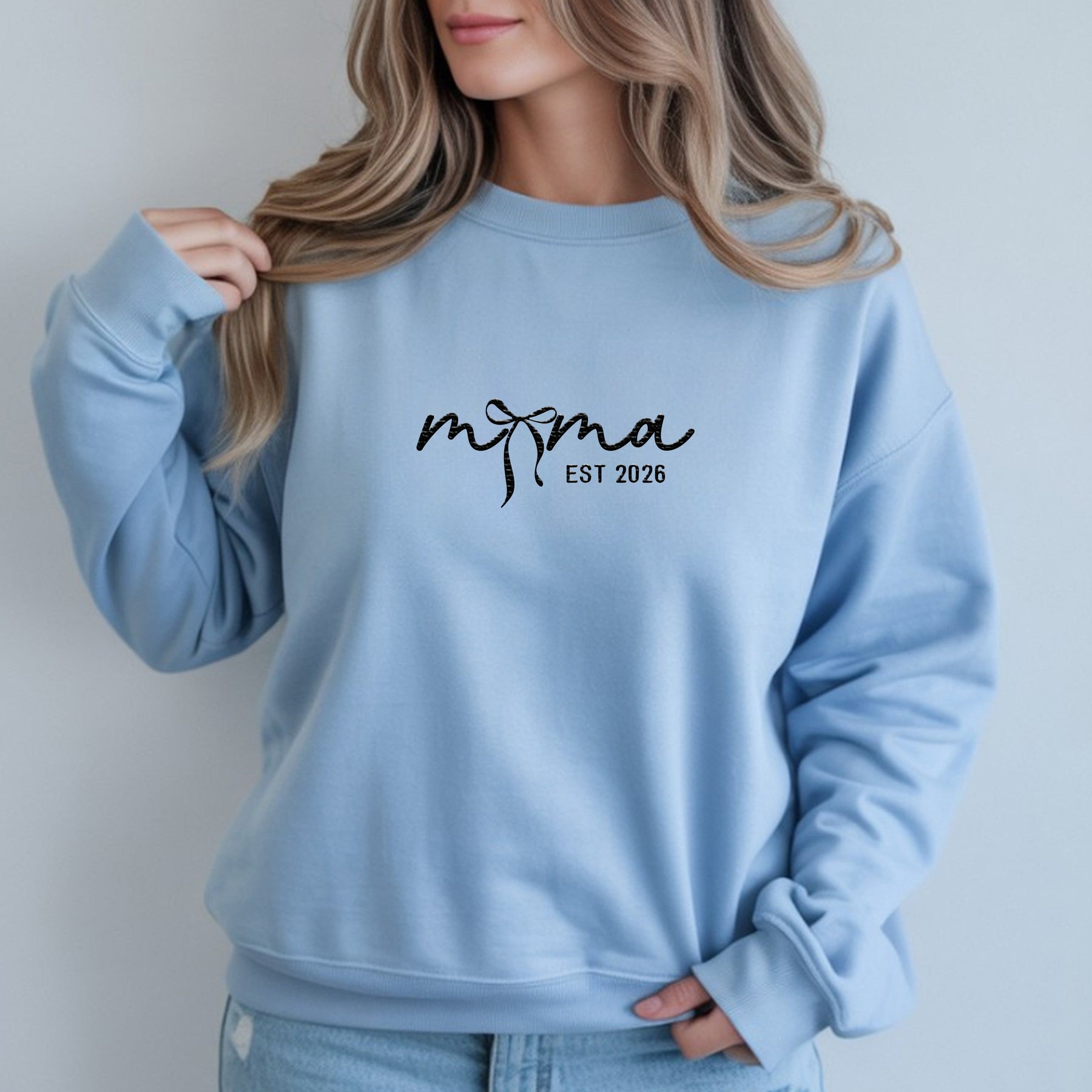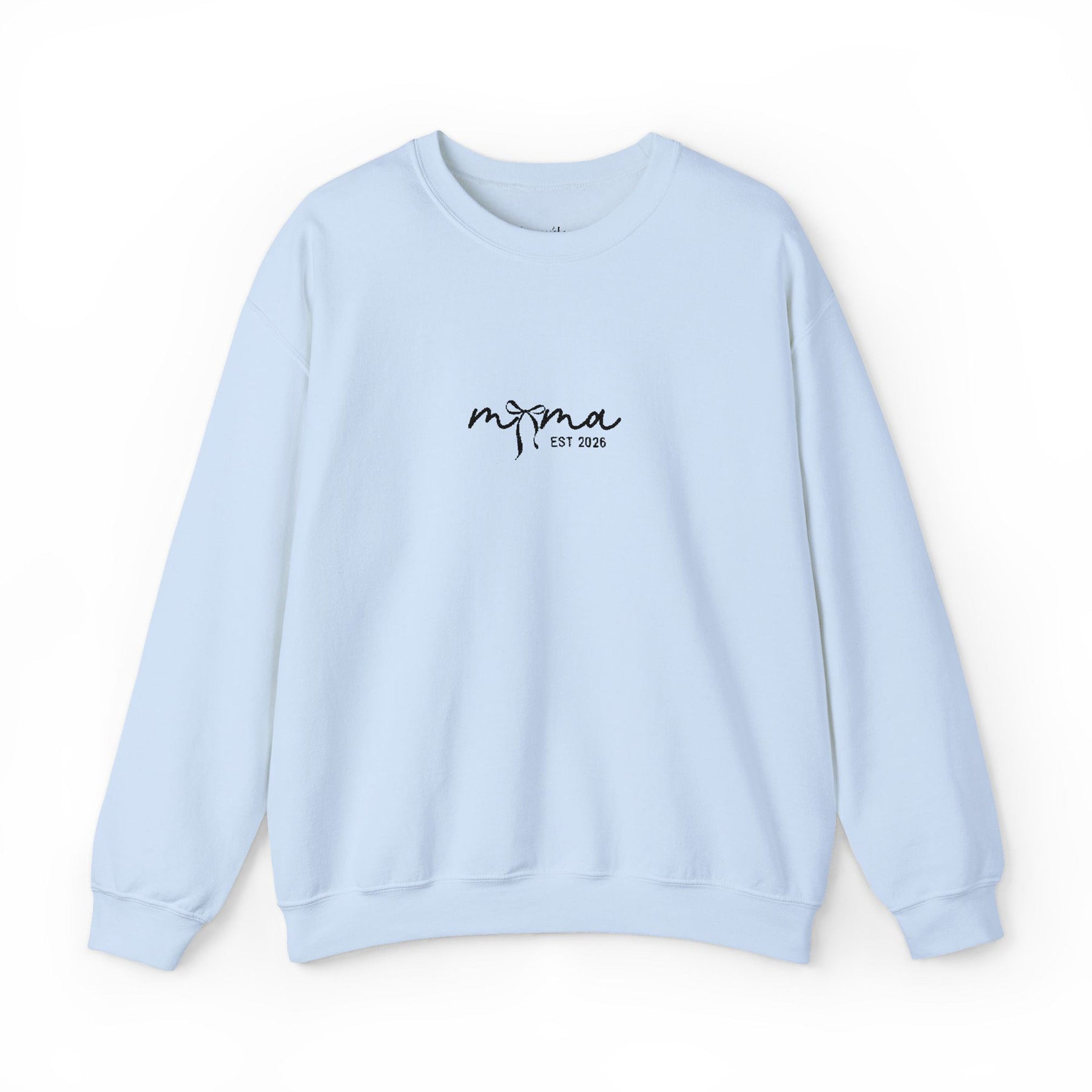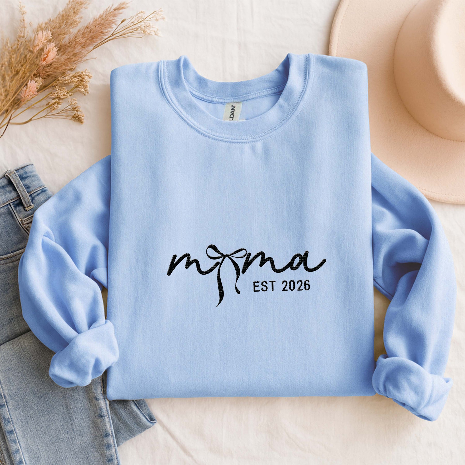 Embroidered Mama EST 2026 Coquette Bow Crewneck | Gildan 18000 | Embroidery Mom Sweatshirt, New Mom Gift, Pregnancy Announcement