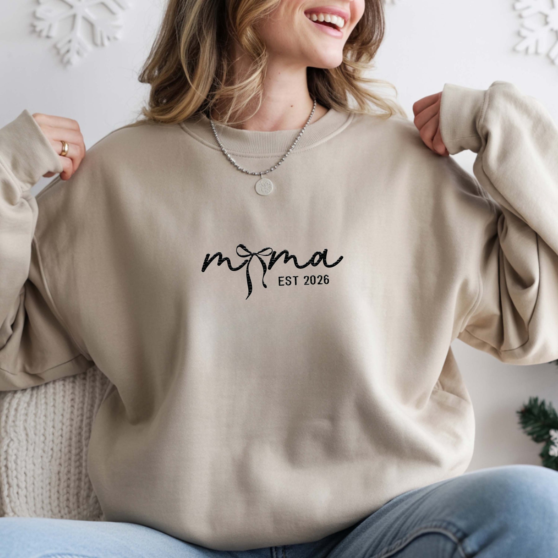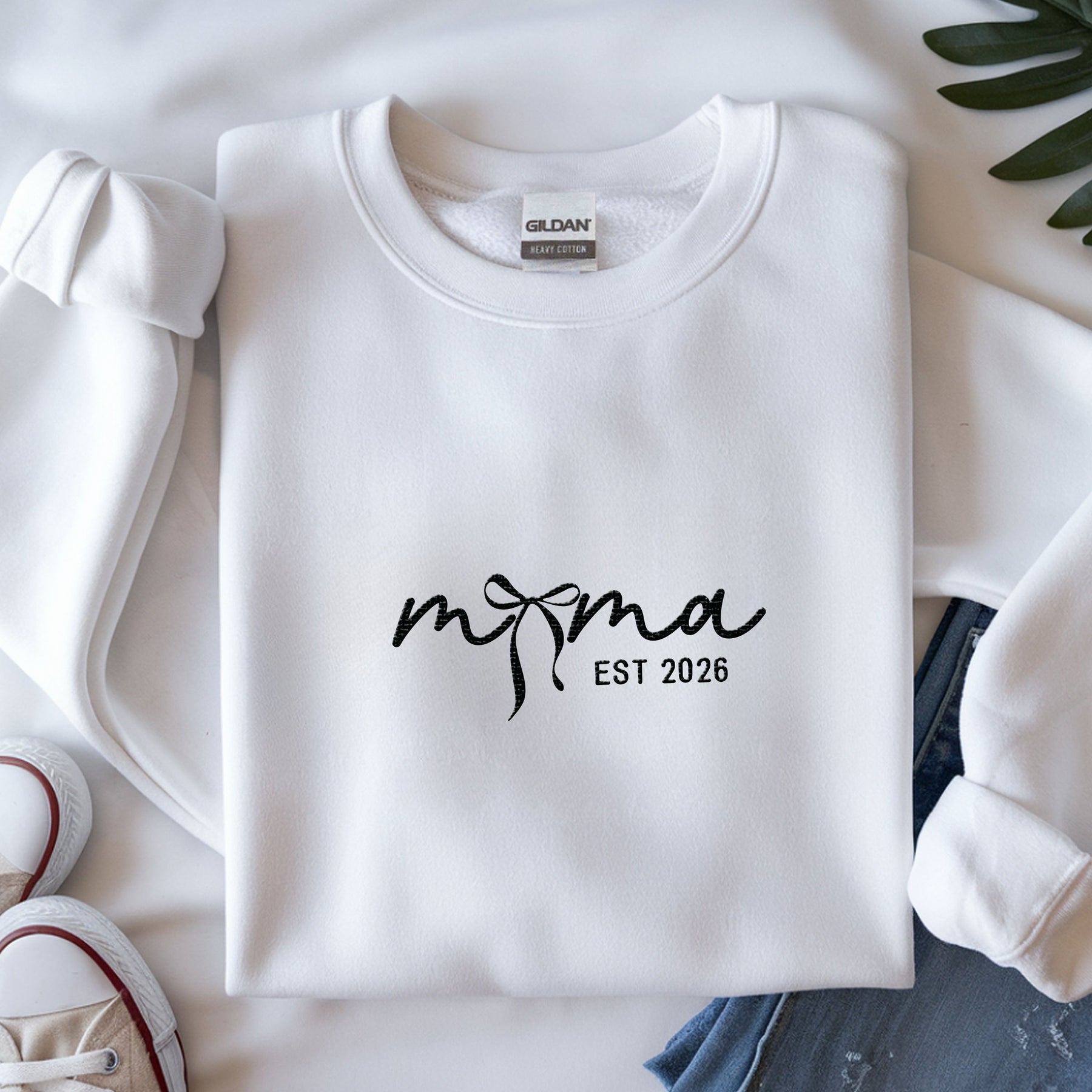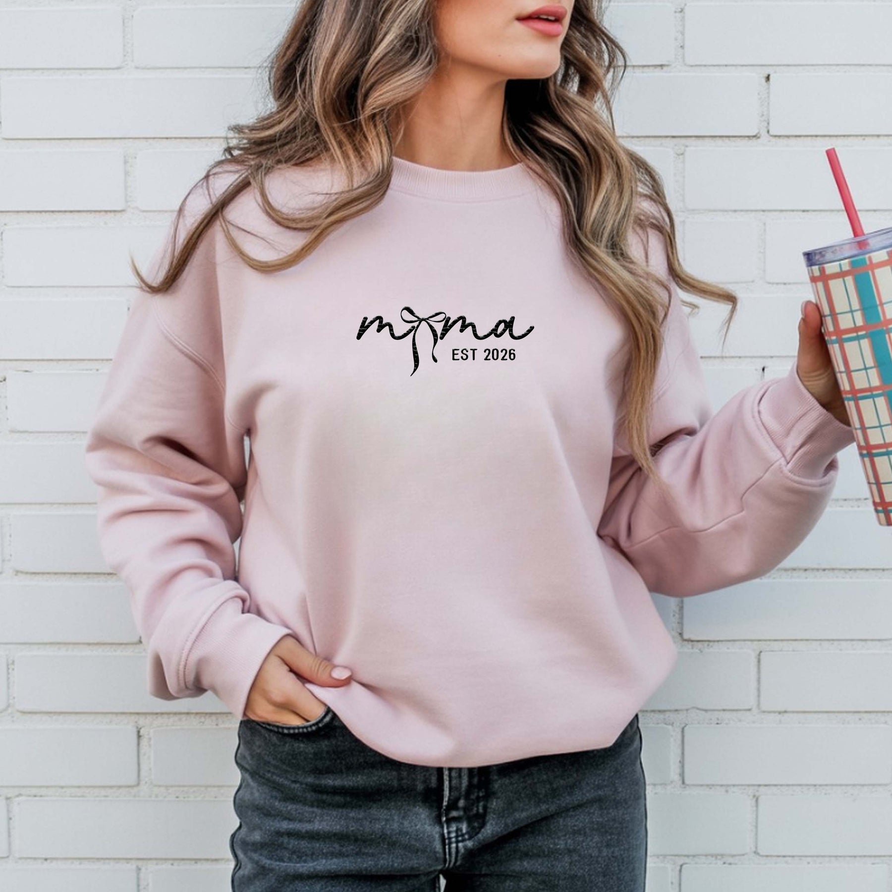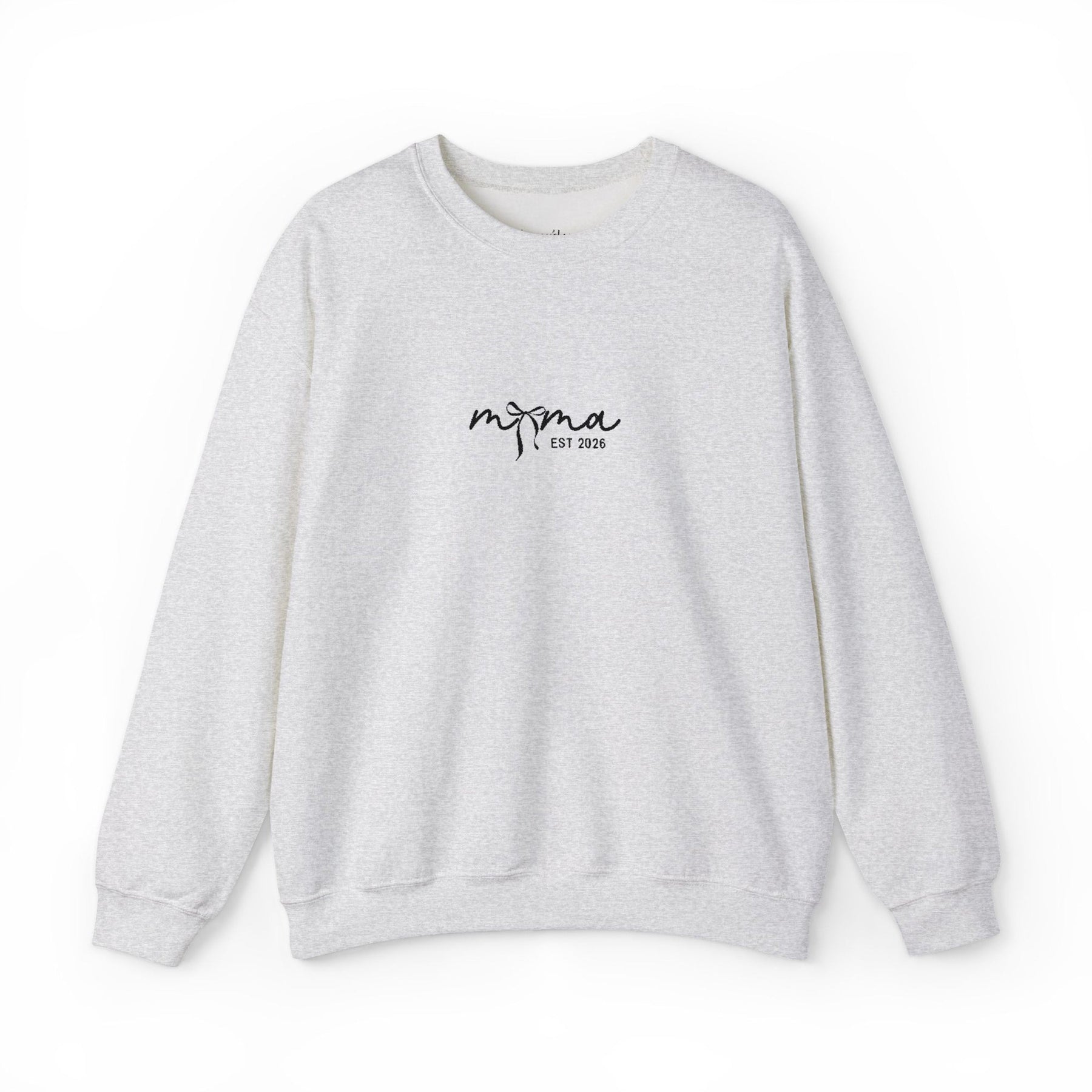 Embroidered Mama EST 2026 Coquette Bow Crewneck | Gildan 18000 | Embroidery Mom Sweatshirt, New Mom Gift, Pregnancy Announcement