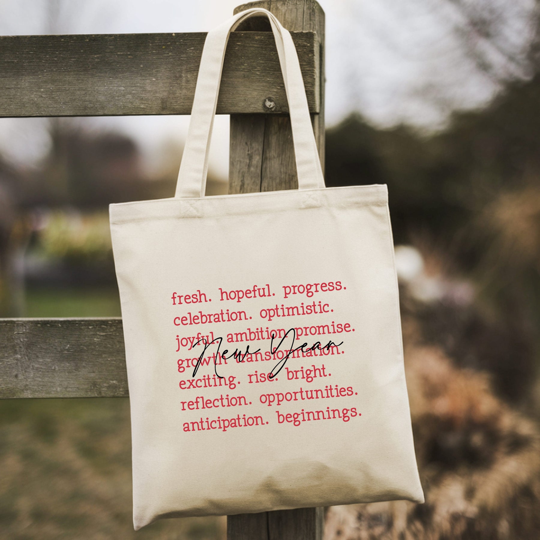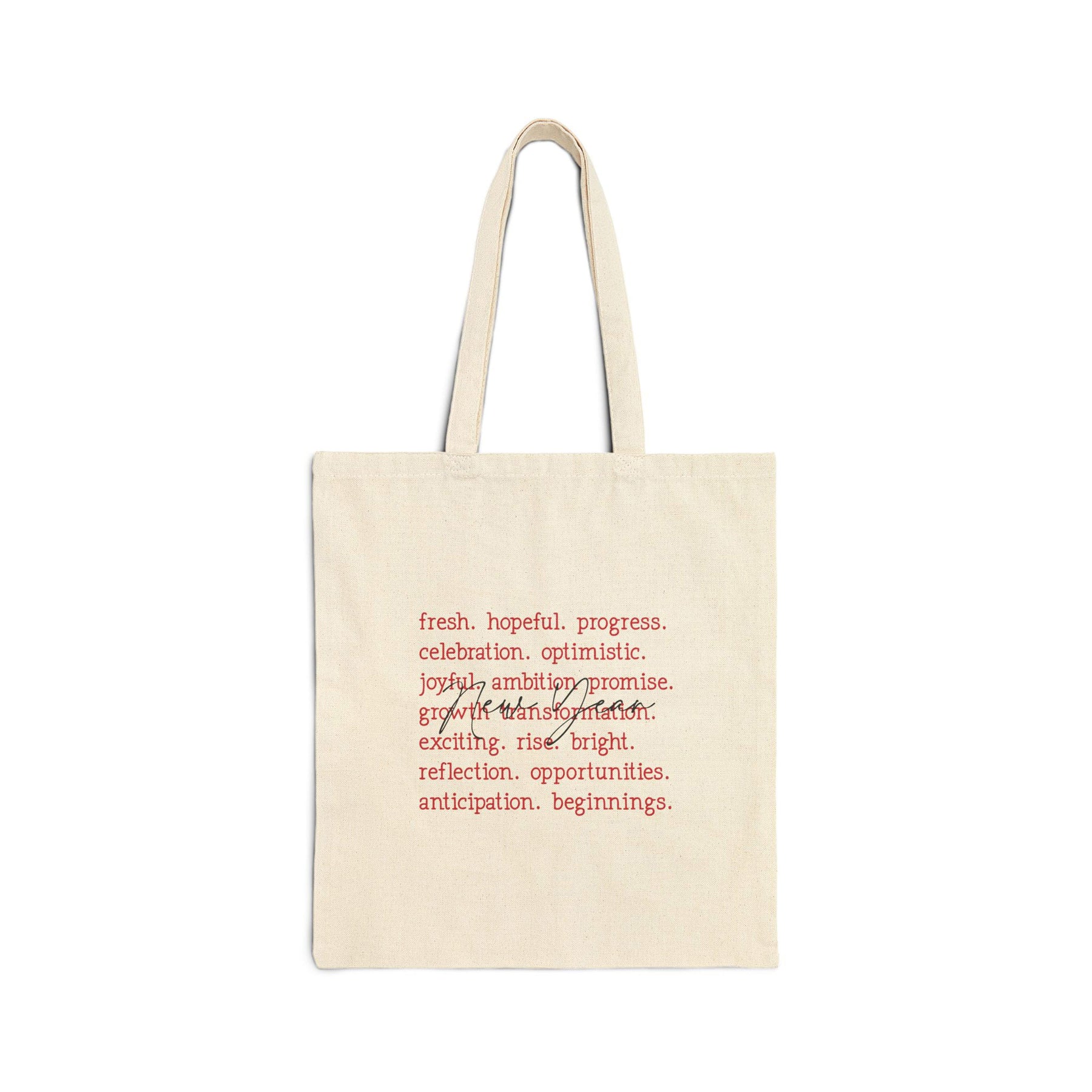 A sturdy cotton canvas tote that feels lived-in from the first carry. The heavy 12 oz fabric and flat-corner construction give it a clean, boxy silhouette that holds books, groceries, or a laptop without sagging. Long self-fabric handles with reinforced stitching sit comfortably over the shoulder, and the sewn-in label and natural or black colorways keep the look simple and wearable. The subtle, text-based design on the front reads like a private list of hopes and new starts — a quiet, optimistic accent for days when you want your bag to say something gentle and real.