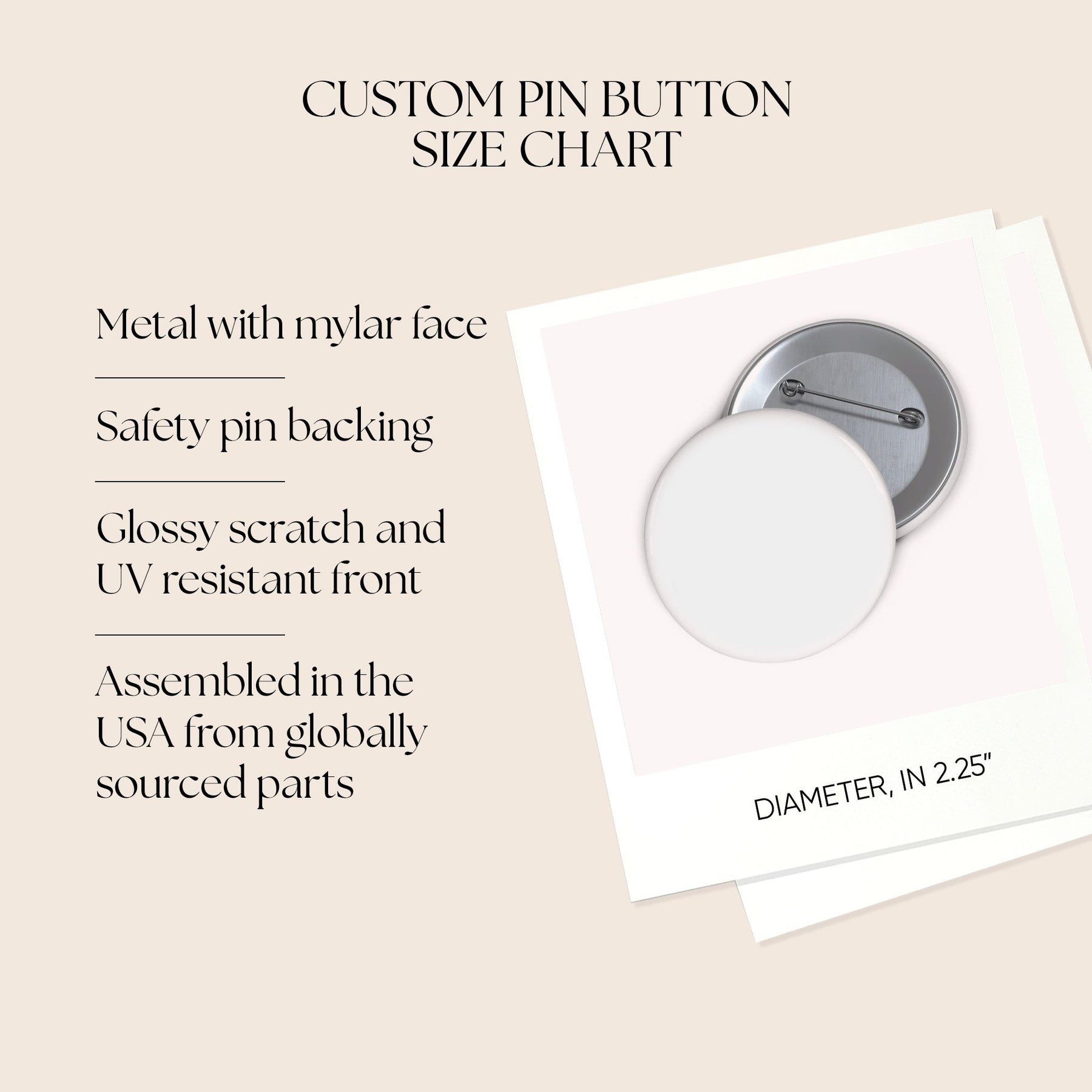 Small, cheerful pin buttons that bring personality to jackets, bags, hats, and patchwork displays. The glossy, full-color face pops with bright, crisp inks and a protective mylar layer that resists scratches and UV fading. Each button secures with a sturdy steel safety pin back so it stays put through everyday wear. Available in three sizes and assembled in the USA from globally sourced parts, these pins are lightweight, tactile accents that celebrate whatever message or design you choose.